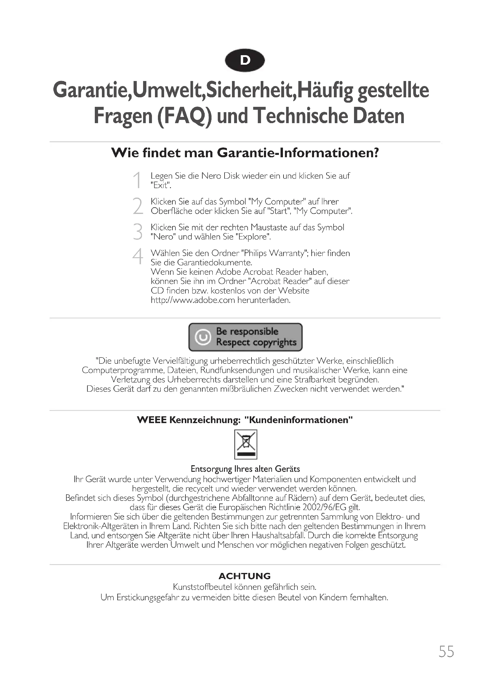 Wählen Sie den Ordner "Philips Warranty"; hier finden Sie die Garantiedokumente. Wenn Sie keinen Adobe Acrobat Reader haben, können Sie ihn im Ordner "Acrobat Reader" auf dieser CD finden bzw. kostenlos von der Website http://www.adobe.com herunterladen. "Die unbefugte Vervielfältigung urheberrechtlich geschützter Werke, einschließlich Computerprogramme, Dateien, Rundfunksendungen und musikalischer Werke, kann eine Verletzung des Urheberrechts darstellen und eine Strafbarkeit begründen. Dieses Gerät darf zu den genannten mißbräulichen Zwecken nicht verwendet werden." WEEE Kennzeichnung: "Kundeninformationen" Entsorgung Ihres alten Geräts Ihr Gerät wurde unter Verwendung hochwertiger Materialien und Komponenten entwickelt und hergestellt, die recycelt und wieder verwendet werden können. Befindet sich dieses Symbol (durchgestrichene Abfalltonne auf Rädern) auf dem Gerät, bedeutet dies, dass für dieses Gerät die Europäischen Richtlinie 2002/96/EG gilt. Informieren Sie sich über die geltenden Bestimmungen zur getrennten Sammlung von Elektro- und Elektronik-Altgeräten in Ihrem Land. Richten Sie sich bitte nach den geltenden Bestimmungen in Ihrem Land, und entsorgen Sie Altgeräte nicht über Ihren Haushaltsabfall. Durch die korrekte Entsorgung Ihrer Altgeräte werden Umwelt und Menschen vor möglichen negativen Folgen geschützt. ACHTUNG Kunststoffbeutel können gefährlich sein. Um Erstickungsgefahr zu vermeiden bitte diesen Beutel von Kindern fernhalten. Garantie,Umwelt,Sicherheit,Häufig gestellte Fragen (FAQ) und Technische Daten D56 Häufig gestellte Fragen (FAQ) Frage 1: Ich habe einen PC mit Windows 98 Second Edition und es befindet sich kein CDROM-Laufwerk im Computer, aber ich habe noch einen anderen PC. Wie kann ich die Treiber installieren?