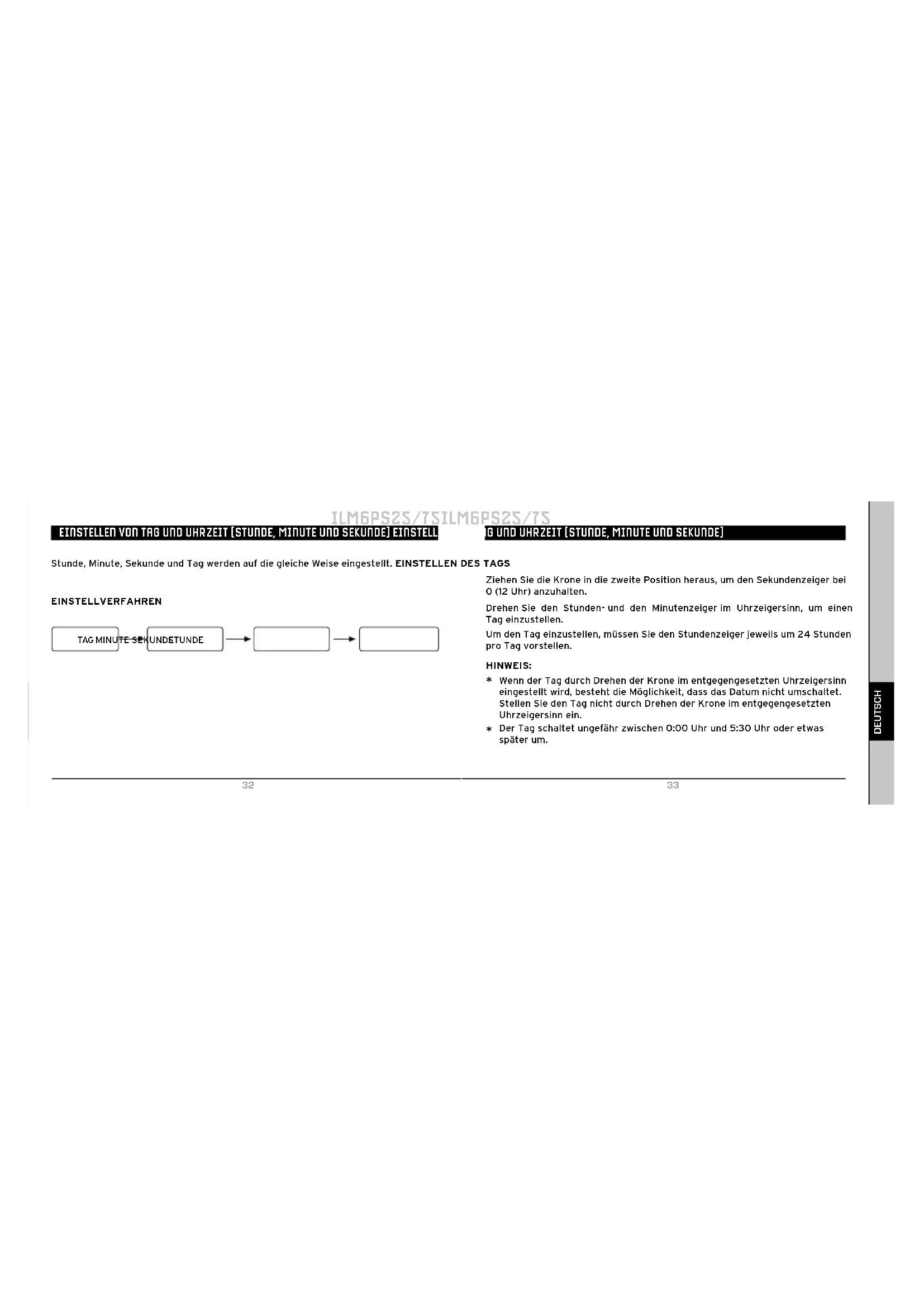 Deutsch EINSTELLEN VON TAG UND UHRZEIT (STUNDE, MINUTE UND SEKUNDE) EINSTELLEN VON TAG UND UHRZEIT (STUNDE, MINUTE UND SEKUNDE) EINSTELLVERFAHREN Stunde, Minute, Sekunde und Tag werden auf die gleiche Weise eingestellt. EINSTELLEN DES TAGS Ziehen Sie die Krone in die zweite Position heraus, um den Sekundenzeiger bei 0 (12 Uhr) anzuhalten. Drehen Sie den Stunden- und den Minutenzeiger im Uhrzeigersinn, um einen Tag einzustellen. Um den Tag einzustellen, müssen Sie den Stundenzeiger jeweils um 24 Stunden pro Tag vorstellen. HINWEIS: