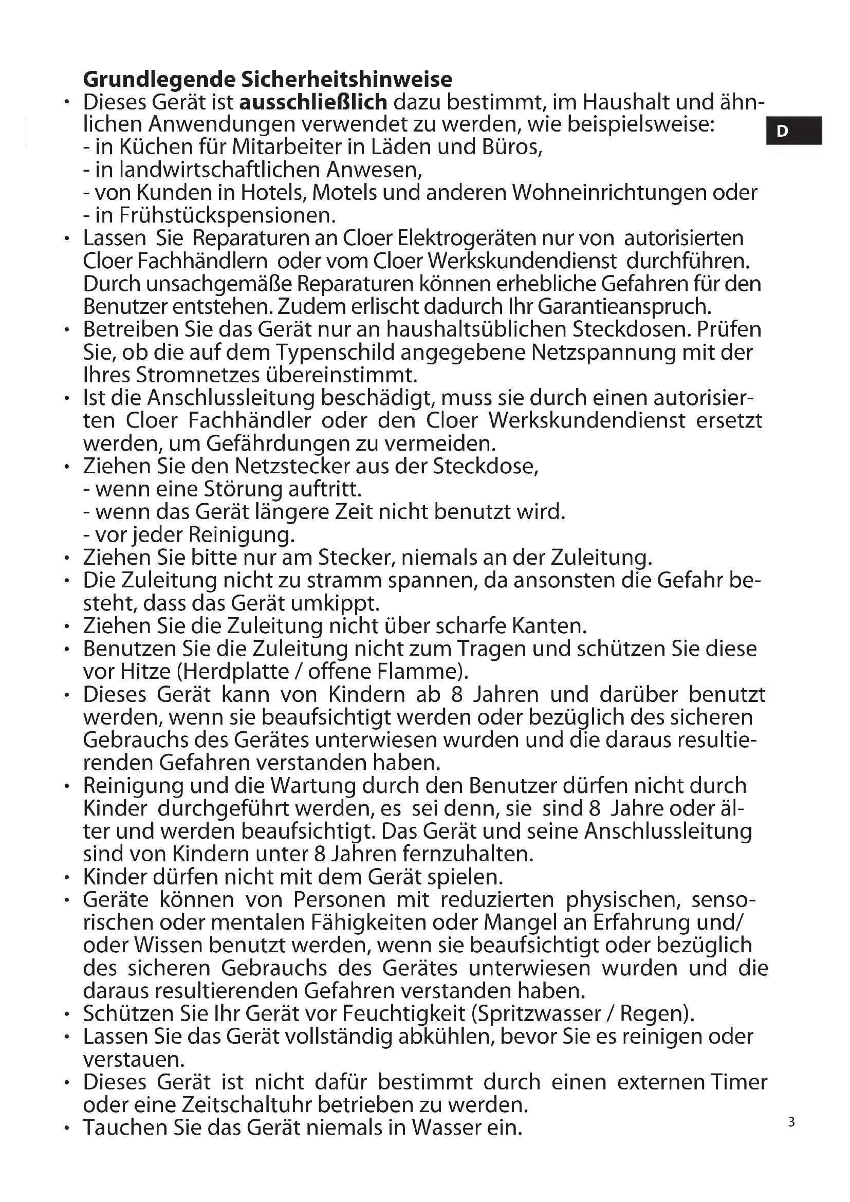 Cloer gewährt Ihnen, dem privaten Endverbraucher, eine limitierte Herstellergarantie. Bei sorgfältiger Behandlung und Bechtung der Bedienungsanleitung sowie der Sicherheitschinweise verpflichten wir uns, das Gerät kostenlos instanzusetzen, soweit es sich um Material- oder Herstellungsfehler handelt. Die Instandsetzung erfolgt durch Reparatur bzw. Ersatz der schad-haften Komponenten. AusgewechSELte Teile werden Eigentum der Firma Cloer. Weitere Ansprüche, gleich welcher Art, insbesondere Schadenersatzansprüche, sind ausgeschlossen. These Garantie beeinträchtigt keine Rechte, die Verbraucher gemäß den jeweils geltenden nationalen Gesetzen bezüglich des Verkaufs von Waren haben.