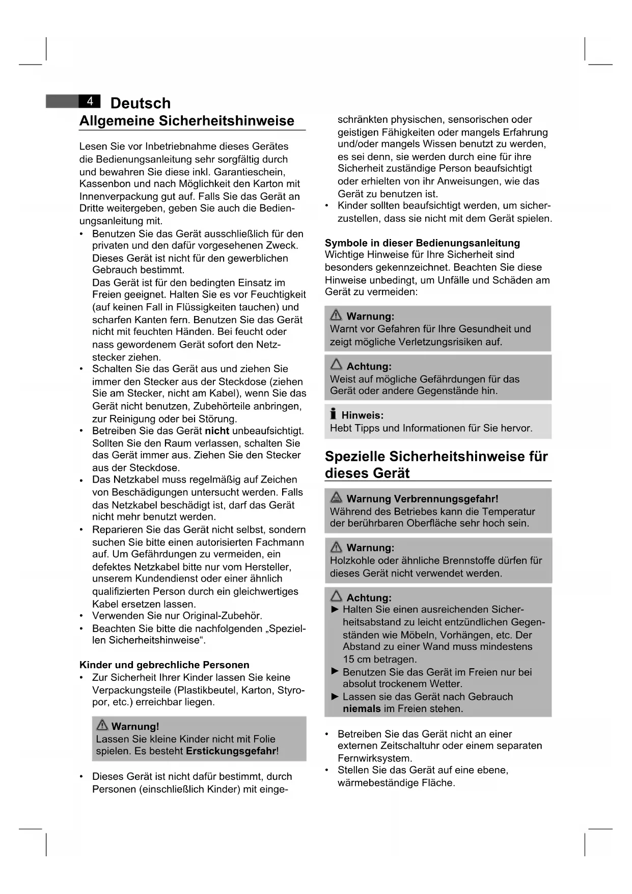 schränkten physischen, sensorischen oder geistigen Fähigkeiten oder mangels Erfahrung und/oder mangels Wissen benutzt zu werden, es sei denn, sie werden durch eine für ihre Sicherheit zuständige Person beaufsichtigt oder erhielten von ihr Anweisungen, wie das Gerät zu benutzen ist. Kinder sollten beaufsichtigt werden, um sicher- zustellen, dass sie nicht mit dem Gerät spielen. Symbole in dieser Bedienungsanleitung Wichtige Hinweise für Ihre Sicherheit sind besonders gekennzeichnet. Beachten Sie diese Hinweise unbedingt, um Unfälle und Schäden am Gerät zu vermeiden: Warnung: Warnt vor Gefahren für Ihre Gesundheit und zeigt mögliche Verletzungsrisiken auf. Achtung: Weist auf mögliche Gefährdungen für das Gerät oder andere Gegenstände hin. Hinweis: Hebt Tipps und Informationen für Sie hervor. Spezielle Sicherheitshinweise für dieses Gerät Warnung Verbrennungsgefahr! Während des Betriebes kann die Temperatur der berührbaren Oberäche sehr hoch sein. Warnung: Holzkohle oder ähnliche Brennstoffe dürfen für dieses Gerät nicht verwendet werden. Achtung: Halten Sie einen ausreichenden Sicher- heitsabstand zu leicht entzündlichen Gegen- ständen wie Möbeln, Vorhängen, etc. Der Abstand zu einer Wand muss mindestens 15 cm betragen. Benutzen Sie das Gerät im Freien nur bei absolut trockenem Wetter. Lassen sie das Gerät nach Gebrauch niemals im Freien stehen. Betreiben Sie das Gerät nicht an einer externen Zeitschaltuhr oder einem separaten Fernwirksystem. Stellen Sie das Gerät auf eine ebene, wärmebeständige Fläche.