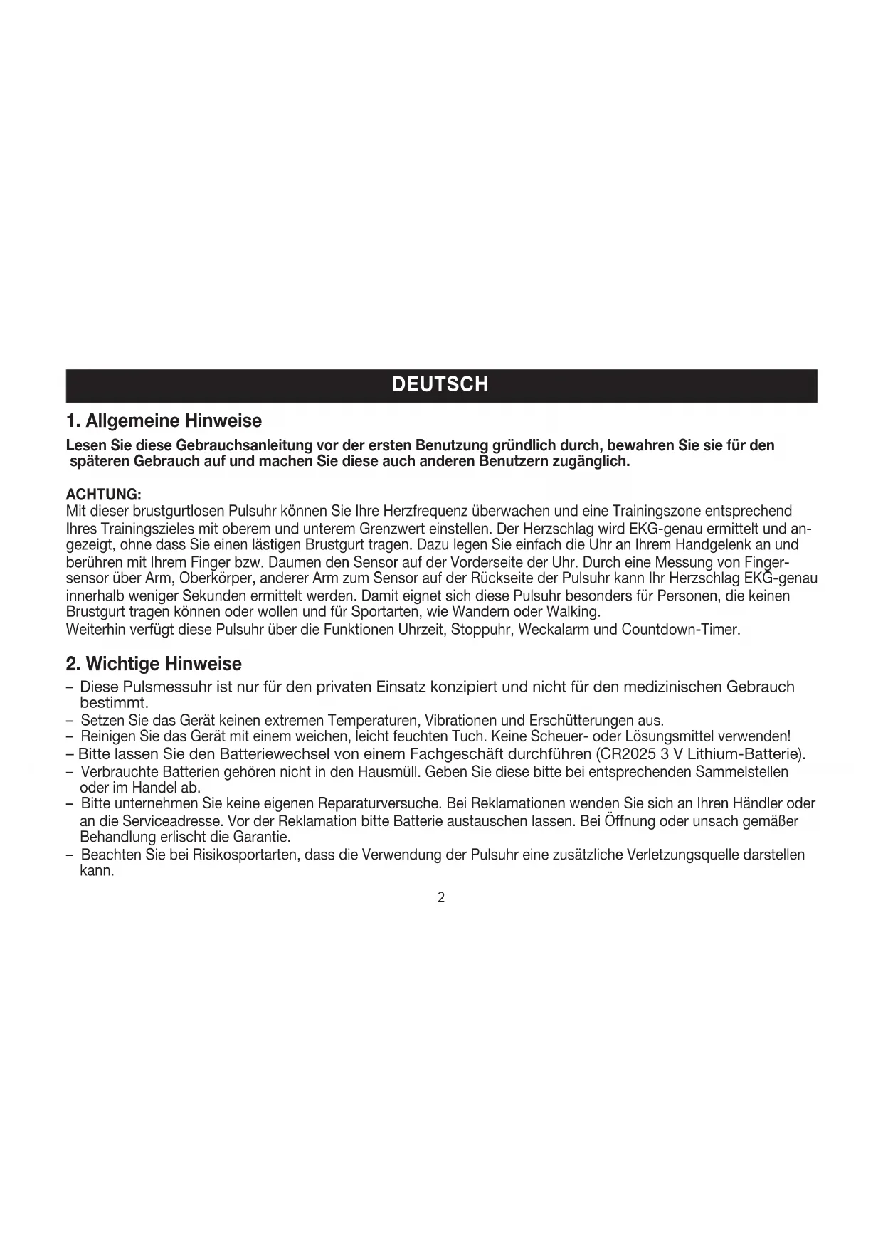 Diese Pulsmessuhr ist nur für den privaten Einsatz konzipiert und nicht für den medizinischen Gebrauch bestimmt. – Setzen Sie das Gerät keinen extremen Temperaturen, Vibrationen und Erschütterungen aus. – Reinigen Sie das Gerät mit einem weichen, leicht feuchten Tuch. Keine Scheuer- oder Lösungsmittel verwenden! – Bitte lassen Sie den Batteriewechsel von einem Fachgeschäft durchführen (CR2025 3 V Lithium-Batterie). – Verbrauchte Batterien gehören nicht in den Hausmüll. Geben Sie diese bitte bei entsprechenden Sammelstellen oder im Handel ab. – Bitte unternehmen Sie keine eigenen Reparaturversuche. Bei Reklamationen wenden Sie sich an Ihren Händler oder an die Serviceadresse. Vor der Reklamation bitte Batterie austauschen lassen. Bei Öffnung oder unsach gemäßer Behandlung erlischt die Garantie. – Beachten Sie bei Risikosportarten, dass die Verwendung der Pulsuhr eine zusätzliche Verletzungsquelle darstellen kann.3 – Dieses Gerät darf nur für den Zweck verwendet werden, für den es entwickelt wurde und auf die in der Gebrauchs- anweisung angegebene Art und Weise. Jeder unsachgemäße Gebrauch kann gefährlich sein. Der Hersteller haftet nicht für Schäden, die durch unsachgemäßen oder falschen Gebrauch verursacht wurden. – Vor dem Gebrauch ist sicherzustellen, dass das Gerät keine sichtbaren Schäden aufweist. Benutzen Sie es im Zweifelsfall nicht und wenden Sie sich an Ihren Händler oder an die angegebene Kundendienstadresse. – Diese Pulsuhr ist wasserdicht (50 m) und damit zum Schwimmen geeignet. Während des Schwimmens dürfen Sie jedoch keine Taste drücken, also auch keine Pulsmessung durchführen. – Vermeiden Sie Kontakt mit Sonnencremes oder ähnlichen Produkten, da diese die Bedruckung oder sogar die Kunststoffteile beschädigen könnten. – Bitte erkundigen Sie sich bei Ihrem Trainer oder behandelnden Arzt über Ihre eigenen Werte bezüglich oberer und unterer Trainings-Herzfrequenz sowie Dauer und Häufigkeit des Trainings. Somit können Sie optimale Ergebnisse beim Training erzielen. – ACHTUNG: Personen mit Herz-Kreislaufkrankheiten oder Träger von Herzschrittmachern sollten diese Pulsuhr nur nach Rücksprache mit Ihrem Arzt verwenden.