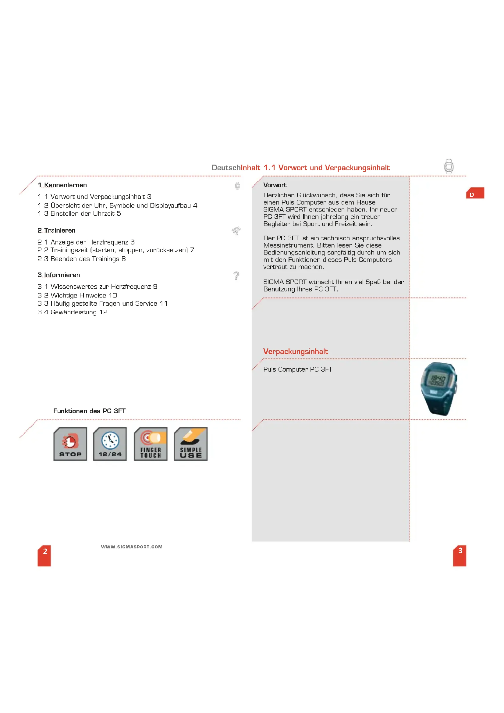 Vorwort Herzlichen Glückwunsch, dass Sie sich für einen Puls Computer aus dem Hause SIGMA SPORT entschieden haben. Ihr neuer PC 3FT wird Ihnen jahrelang ein treuer Begleiter bei Sport und Freizeit sein. Der PC 3FT ist ein technisch anspruchsvolles Messinstrument. Bitten lesen Sie diese Bedienungsanleitung sorgfältig durch um sich mit den Funktionen dieses Puls Computers vertraut zu machen. SIGMA SPORT wünscht Ihnen viel Spaß bei der Benutzung Ihres PC 3FT.