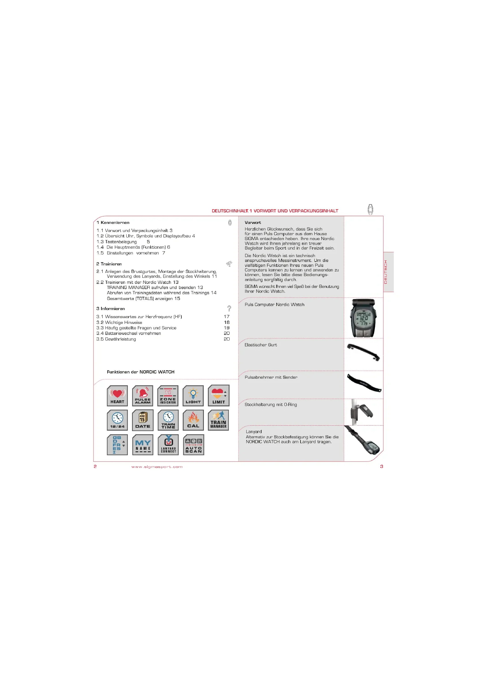Wir haften gegenüber unserem jeweiligen Vertragspartner für Mängel nach den gesetzlichen Vorschriften. Batterien sind von der Gewährleistung ausgenommen. Im Falle der Gewährleistung kontaktieren Sie bitte den Händler, bei dem Sie Ihren Puls Computer gekauft haben, oder senden Sie den Puls Computer mit Kaufbeleg und allen Zubehörteilen, ausreichend frankiert, an: SIGMA Elektro GmbH Dr.-Julius-Leber-Strasse 15 D-67433 Neustadt/Weinstrasse Service-Tel. +49-(0)6321-9120-118 E-Mail: service@sigmasport.com Bei berechtigten Ansprüchen auf Gewährleistung erhalten Sie ein Austauschgerät. Es besteht nur Anspruch auf das zu diesem Zeitpunkt aktuelle Modell. Der Hersteller behält sich technische Änderungen vor.ENGLISH ENGLISHCONTENTS 1 Your new Nordic Watch