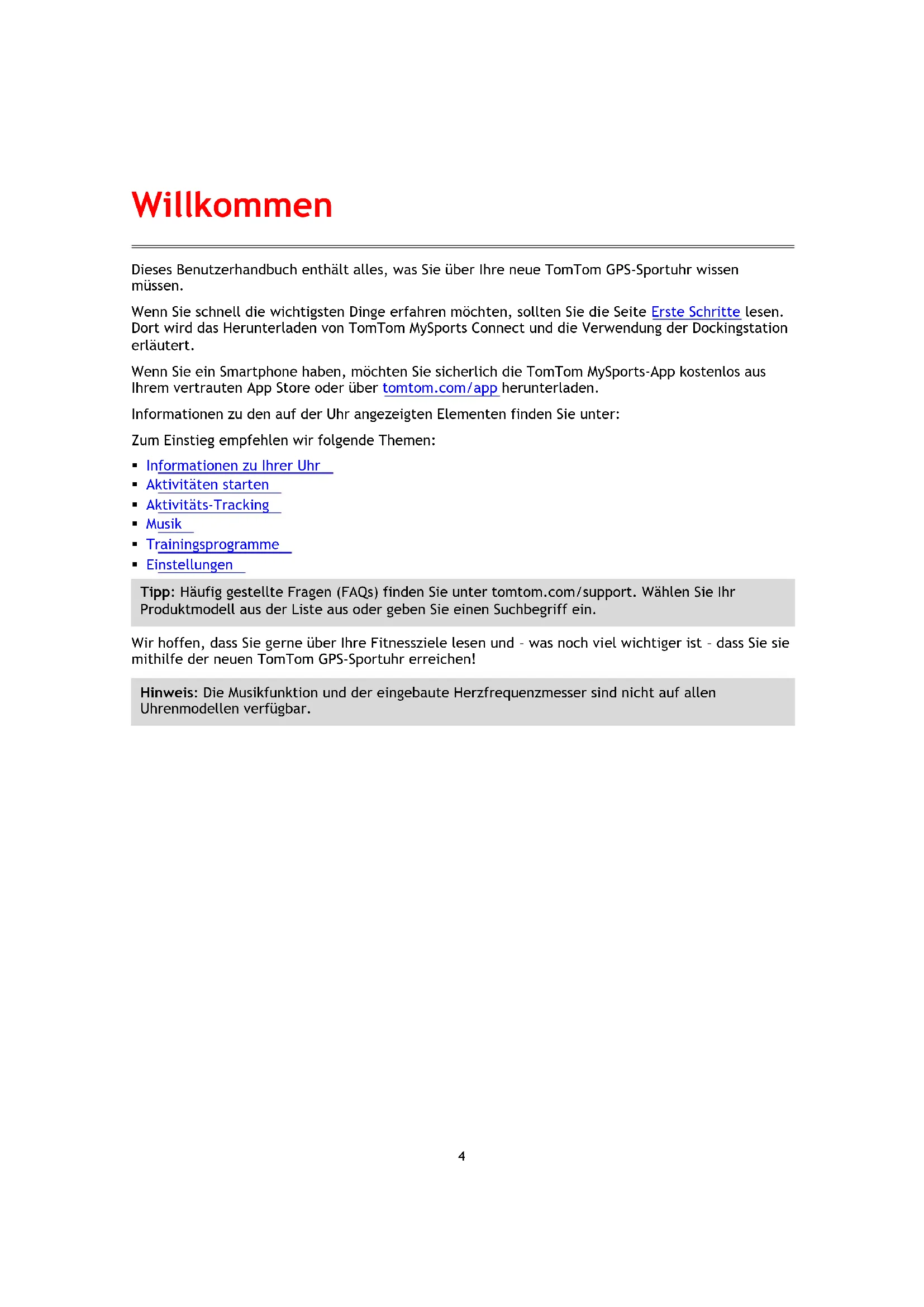 Dieses Benutzerhandbuch enthält alles, was Sie über Ihre neue TomTom GPS-Sportuhr wissen müssen. Wenn Sie schnell die wichtigsten Dinge erfahren möchten, sollten Sie die Seite Erste Schritte lesen. Dort wird das Herunterladen von TomTom MySports Connect und die Verwendung der Dockingstation erläutert. Wenn Sie ein Smartphone haben, möchten Sie sicherlich die TomTom MySports-App kostenlos aus Ihrem vertrauten App Store oder über tomtom.com/app herunterladen. Informationen zu den auf der Uhr angezeigten Elementen finden Sie unter: Zum Einstieg empfehlen wir folgende Themen: Informationen zu Ihrer Uhr Aktivitäten starten Aktivitäts-Tracking Musik Trainingsprogramme Einstellungen Tipp: Häufig gestellte Fragen (FAQs) finden Sie unter tomtom.com/support. Wählen Sie Ihr Produktmodell aus der Liste aus oder geben Sie einen Suchbegriff ein. Wir hoffen, dass Sie gerne über Ihre Fitnessziele lesen und – was noch viel wichtiger ist – dass Sie sie mithilfe der neuen TomTom GPS-Sportuhr erreichen! Hinweis: Die Musikfunktion und der eingebaute Herzfrequenzmesser sind nicht auf allen Uhrenmodellen verfügbar. Willkommen5