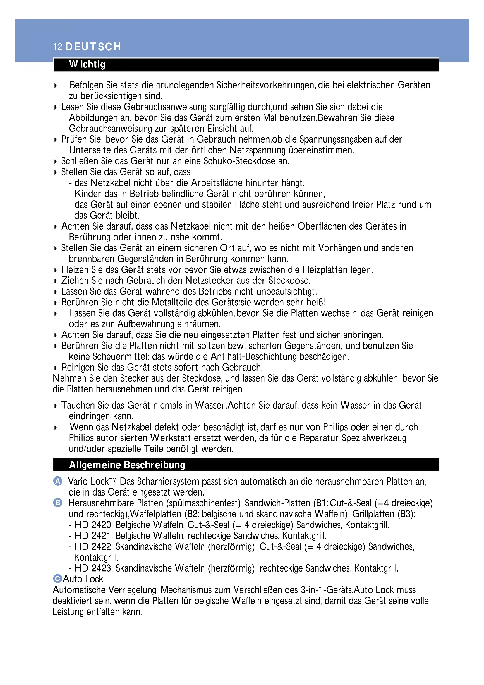 1 tablespoon sugar 2 teaspoons baking powder 1/2 teaspoon salt ™ Sift the dry ingredients into a medium-size bowl. Separate the eggs. Beat egg whites until stiff.Add the egg yolks, oil and milk to the dry ingredients at the same time. Beat until there are no lumps in the batter. Fold the egg whites into the batter using a spatula. Cook the waffles. Variation:You can also use brown (wheatmeal) flour instead of white flour. Brown flour contains more fibre. Serve the waffles with cottage cheese and fresh berries. Cleaning 1 Unplug the appliance. 2 Let the appliance cool down before removing the plates. Always remove excess oil from the grilling plates with a piece of kitchen paper before removing them for cleaning. The plates can be removed by pressing the plate release buttons on the appliance, after which they can be lifted out of the appliance by means of the handles. 3 Clean the plates with a soft cloth or sponge in hot soapy water or put them in the dishwasher. Never use abrasive or scouring cleaning agents and materials, as this will damage the non-stick coating of the plate. Residues can be removed by soaking the plates in hot soapy water for five minutes.This will loosen any caked food or grease. 4 Clean the outside of the appliance with a damp cloth Never immerse the appliance in water. 5 Wind the cord (fig.18). The 3-in-1 appliance has a cord storage feature on the base of the appliance. 6 The appliance can be stored in a vertical or horizontal position (fig. 19). Replacing the mains cord If the mains cord of this appliance is damaged, it must only be replaced by Philips or a service centre authorised by Philips, as special tools and/or parts are required. Information & service If you need information or if you have a problem, please visit the Philips Web site at www.philips.com or contact the Philips Customer Care Centre in your country (you will find its phone number in the worldwide guarantee leaflet). If there is no Customer Care Centre in your country, turn to your local Philips dealer or contact the Service Department of Philips Domestic Appliances and Personal Care BV.12 DEUTSCH Wichtig ◗ Befolgen Sie stets die grundlegenden Sicherheitsvorkehrungen, die bei elektrischen Geräten zu berücksichtigen sind. ◗ Lesen Sie diese Gebrauchsanweisung sorgfältig durch,und sehen Sie sich dabei die Abbildungen an, bevor Sie das Gerät zum ersten Mal benutzen.Bewahren Sie diese Gebrauchsanweisung zur späteren Einsicht auf. ◗ Prüfen Sie, bevor Sie das Gerät in Gebrauch nehmen,ob die Spannungsangaben auf der Unterseite des Geräts mit der örtlichen Netzspannung übereinstimmen. ◗ Schließen Sie das Gerät nur an eine Schuko-Steckdose an. ◗ Stellen Sie das Gerät so auf, dass - das Netzkabel nicht über die Arbeitsfläche hinunter hängt, - Kinder das in Betrieb befindliche Gerät nicht berühren können, - das Gerät auf einer ebenen und stabilen Fläche steht und ausreichend freier Platz rund um das Gerät bleibt. ◗ Achten Sie darauf, dass das Netzkabel nicht mit den heißen Oberflächen des Gerätes in Berührung oder ihnen zu nahe kommt. ◗ Stellen Sie das Gerät an einem sicheren Ort auf, wo es nicht mit Vorhängen und anderen brennbaren Gegenständen in Berührung kommen kann. ◗ Heizen Sie das Gerät stets vor,bevor Sie etwas zwischen die Heizplatten legen. ◗ Ziehen Sie nach Gebrauch den Netzstecker aus der Steckdose. ◗ Lassen Sie das Gerät während des Betriebs nicht unbeaufsichtigt. ◗ Berühren Sie nicht die Metallteile des Geräts;sie werden sehr heiß! ◗ Lassen Sie das Gerät vollständig abkühlen,bevor Sie die Platten wechseln,das Gerät reinigen oder es zur Aufbewahrung einräumen. ◗ Achten Sie darauf, dass Sie die neu eingesetzten Platten fest und sicher anbringen. ◗ Berühren Sie die Platten nicht mit spitzen bzw. scharfen Gegenständen, und benutzen Sie keine Scheuermittel; das würde die Antihaft-Beschichtung beschädigen. ◗ Reinigen Sie das Gerät stets sofort nach Gebrauch. Nehmen Sie den Stecker aus der Steckdose, und lassen Sie das Gerät vollständig abkühlen, bevor Sie die Platten herausnehmen und das Gerät reinigen. ◗ Tauchen Sie das Gerät niemals in Wasser.Achten Sie darauf, dass kein Wasser in das Gerät eindringen kann. ◗ Wenn das Netzkabel defekt oder beschädigt ist, darf es nur von Philips oder einer durch Philips autorisierten Werkstatt ersetzt werden, da für die Reparatur Spezialwerkzeug und/oder spezielle Teile benötigt werden. Allgemeine Beschreibung A Vario Lock`Das Scharniersystem passt sich automatisch an die herausnehmbaren Platten an, die in das Gerät eingesetzt werden. B Herausnehmbare Platten (spülmaschinenfest): Sandwich-Platten (B1: Cut-&-Seal (=4 dreieckige) und rechteckig),Waffelplatten (B2: belgische und skandinavische Waffeln), Grillplatten (B3): - HD 2420: Belgische Waffeln, Cut-&-Seal (= 4 dreieckige) Sandwiches, Kontaktgrill. - HD 2421: Belgische Waffeln, rechteckige Sandwiches, Kontaktgrill. - HD 2422: Skandinavische Waffeln (herzförmig), Cut-&-Seal (= 4 dreieckige) Sandwiches, Kontaktgrill. - HD 2423: Skandinavische Waffeln (herzförmig), rechteckige Sandwiches, Kontaktgrill. C Auto Lock Automatische Verriegelung: Mechanismus zum Verschließen des 3-in-1-Geräts.Auto Lock muss deaktiviert sein, wenn die Platten für belgische Waffeln eingesetzt sind, damit das Gerät seine volle Leistung entfalten kann.13DEUTSCH D Cool-Touch Griffe E Kontroll-Lampe "Gerät angeschlossen" Diese rote Lampe leuchtet, solange das Gerät am Stromnetz angeschlossen ist. F Kontroll-Lampe "Fertig zum Gebrauch" Diese grüne Lampe leuchtet, solange die 3-in-1-Platten aufgeheizt werden. Sie erlischt, wenn das Gerät zum betriebsbereit ist. G Netzkabelaufwicklung H Entriegelung für die Platten I Thermostat-Schalter J Griffe der Platte Vor dem Gebrauch Um die Platten herauszunehmen, drücken Sie die Entriegelung am Gerät. Danach können die Platten an ihren Griffen herausgenommen werden. 1 Entnehmen Sie die Platten aus