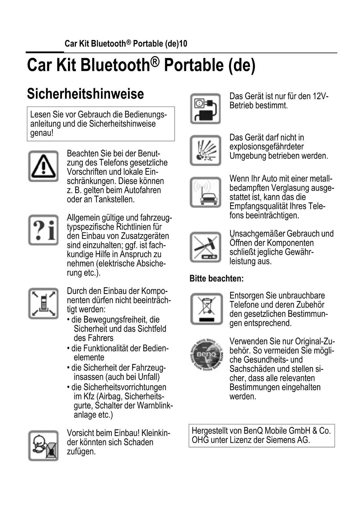 - die Sicherheitsvorrichtungen im Kfz (Airbag, Sicherheits- gurte, Schalter der Warnblink- anlage etc.) Vorsicht beim Einbau! Kleinkin- der könnten sich Schaden zufügen. Das Gerät ist nur für den 12V- Betrieb bestimmt. Das Gerät darf nicht in explosionsgefährdeter Umgebung betrieben werden. Wenn Ihr Auto mit einer metall- bedampften Verglasung ausge- stattet ist, kann das die Empfangsqualität Ihres Tele- fons beeinträchtigen. Unsachgemäßer Gebrauch und Öffnen der Komponenten schließt jegliche Gewähr- leistung aus. Bitte beachten: Entsorgen Sie unbrauchbare Telefone und deren Zubehör den gesetzlichen Bestimmun- gen entsprechend. Verwenden Sie nur Original-Zu- behör. So vermeiden Sie mögli- che Gesundheits- und Sachschäden und stellen si- cher, dass alle relevanten Bestimmungen eingehalten werden. Hergestellt von BenQ Mobile GmbH & Co. OHG unter Lizenz der Siemens AG.right page (11) of CKBP HKW-700 de, A31008-H7421-A110-1-ZE19 (09.02.2006, 19:03) © Siemens AG 2003, Z:\Rust\Accessories\05GUW00118 CKBP Mikrofon Leaflet\Work\Satz\Frame und Grafik\HKW-700_de.fm 11Car Kit Bluetooth