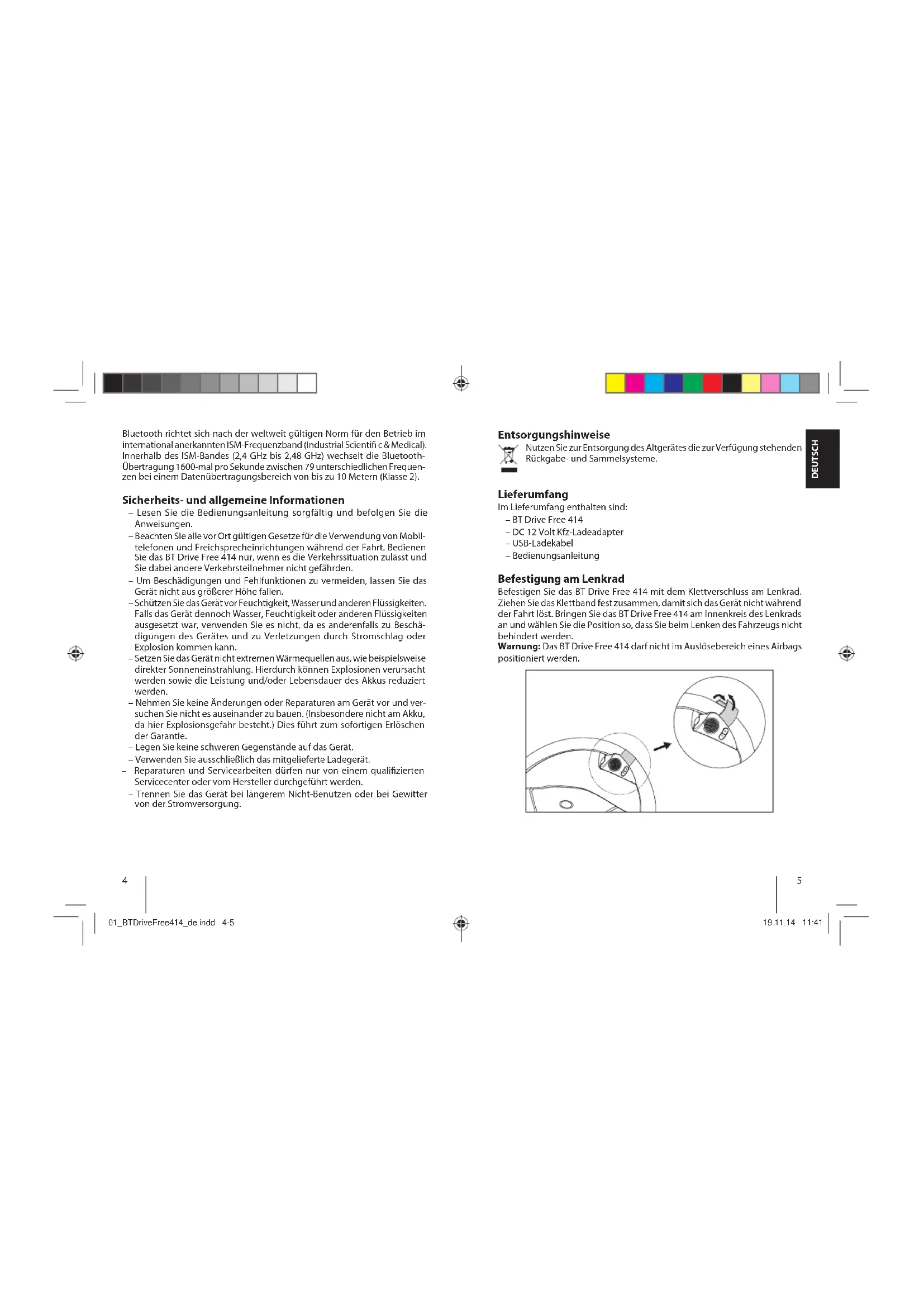 Bluetooth richtet sich nach der weltweit gültigen Norm für den Betrieb im international anerkannten ISM-Frequenzband (Industrial Scienti c & Medical). Innerhalb des ISM-Bandes (2,4 GHz bis 2,48 GHz) wechselt die Bluetooth- Übertragung 1600-mal pro Sekunde zwischen 79 unterschiedlichen Frequen- zen bei einem Datenübertragungsbereich von bis zu 10 Metern (Klasse 2). Sicherheits- und allgemeine Informationen – Lesen Sie die Bedienungsanleitung sorgfältig und befolgen Sie die Anweisungen. – Beachten Sie alle vor Ort gültigen Gesetze für die Verwendung von Mobil- telefonen und Freichsprecheinrichtungen während der Fahrt. Bedienen Sie das BT Drive Free 414 nur, wenn es die Verkehrssituation zulässt und Sie dabei andere Verkehrsteilnehmer nicht gefährden. – Um Beschädigungen und Fehlfunktionen zu vermeiden, lassen Sie das Gerät nicht aus größerer Höhe fallen. – Schützen Sie das Gerät vor Feuchtigkeit, Wasser und anderen Flüssigkeiten. Falls das Gerät dennoch Wasser, Feuchtigkeit oder anderen Flüssigkeiten ausgesetzt war, verwenden Sie es nicht, da es anderenfalls zu Beschä- digungen des Gerätes und zu Verletzungen durch Stromschlag oder Explosion kommen kann. – Setzen Sie das Gerät nicht extremen Wärmequellen aus, wie beispielsweise direkter Sonneneinstrahlung. Hierdurch können Explosionen verursacht werden sowie die Leistung und/oder Lebensdauer des Akkus reduziert werden. – Nehmen Sie keine Änderungen oder Reparaturen am Gerät vor und ver- suchen Sie nicht es auseinander zu bauen. (Insbesondere nicht am Akku, da hier Explosionsgefahr besteht.) Dies führt zum sofortigen Erlöschen der Garantie. – Legen Sie keine schweren Gegenstände auf das Gerät. – Verwenden Sie ausschließlich das mitgelieferte Ladegerät. – Reparaturen und Servicearbeiten dürfen nur von einem quali zierten Servicecenter oder vom Hersteller durchgeführt werden. – Trennen Sie das Gerät bei längerem Nicht-Benutzen oder bei Gewitter von der Stromversorgung. Entsorgungshinweise Nutzen Sie zur Entsorgung des Altgerätes die zur Verfügung stehenden Rückgabe- und Sammelsysteme. Lieferumfang Im Lieferumfang enthalten sind: – BT Drive Free 414 – DC 12 Volt Kfz-Ladeadapter – USB-Ladekabel – Bedienungsanleitung Befestigung am Lenkrad Befestigen Sie das BT Drive Free 414 mit dem Klettverschluss am Lenkrad. Ziehen Sie das Klettband fest zusammen, damit sich das Gerät nicht während der Fahrt löst. Bringen Sie das BT Drive Free 414 am Innenkreis des Lenkrads an und wählen Sie die Position so, dass Sie beim Lenken des Fahrzeugs nicht behindert werden. Warnung: Das BT Drive Free 414 darf nicht im Auslösebereich eines Airbags positioniert werden. 01_BTDriveFree414_de.indd 4-501_BTDriveFree414_de.indd 4-5 19.11.14 11:4119.11.14 11:41DEUTSCH