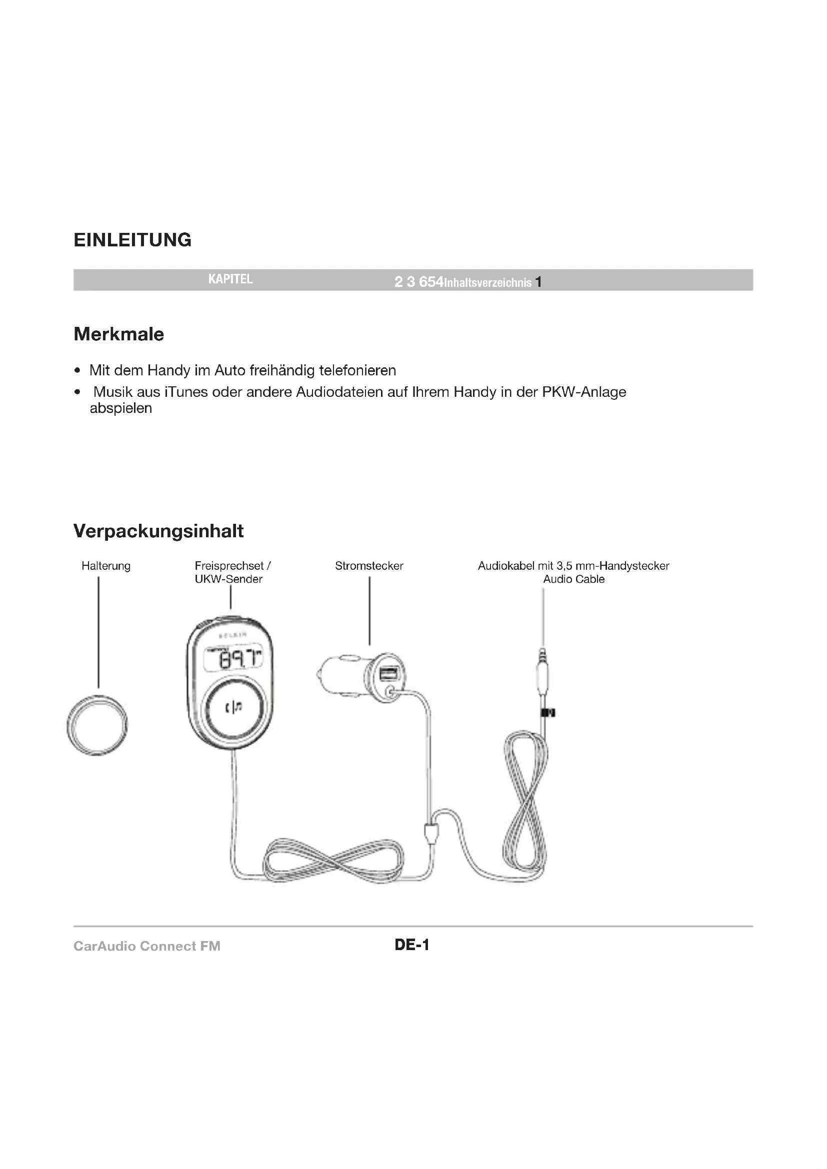 - Musik aus iTunes oder andere Audiodateien auf Ihrem Handy in der PKW-Anlage abspielen Verpackungsinhalt HalterungFreisprechset / UKW-SenderAudiokabel mit 3,5 mm-Handystecker Audio CableStromsteckerCarAudio Connect FM DE-2 KAPITEL 1 3 654Inhaltsverzeichnis 2 ERSTINSTALLATION