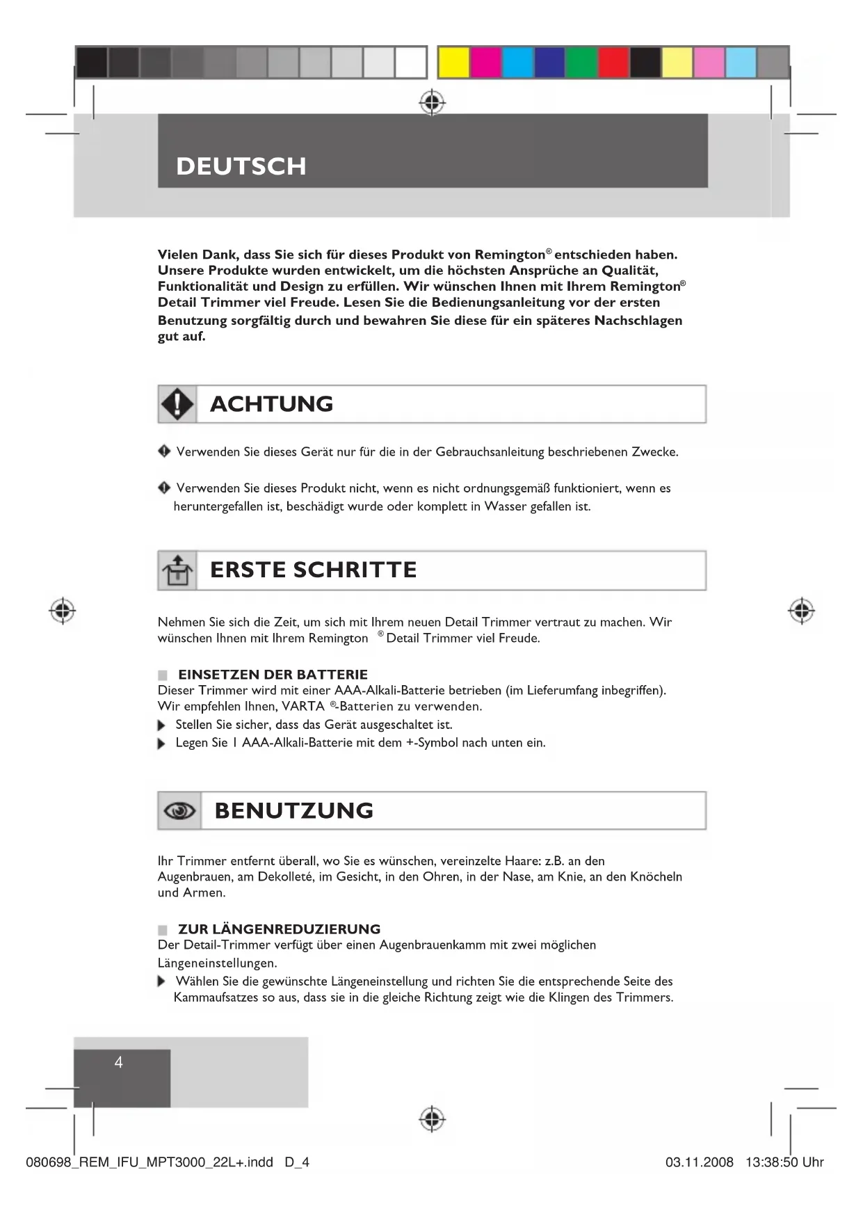 Dieses Gerät enthält eine Alkalibatterie. Schützen Sie unsere Umwelt und werfen Sie das Gerät oder den Akku nicht in den Hausmüll. Beachten Sie die entsprechenden nationalen und lokalen Vorschriften bei der Entsorgung. ACHTUNG: Akkus nicht ins Feuer werfen oder öffnen! Akkus können explodieren oder giftige Stoffe freisetzen. 080698_REM_IFU_MPT3000_22L+.indd D_5080698_REM_IFU_MPT3000_22L+.indd D_5 03.11.2008 13:38:50 Uhr03.11.2008 13:38:50 UhrDEUTSCH