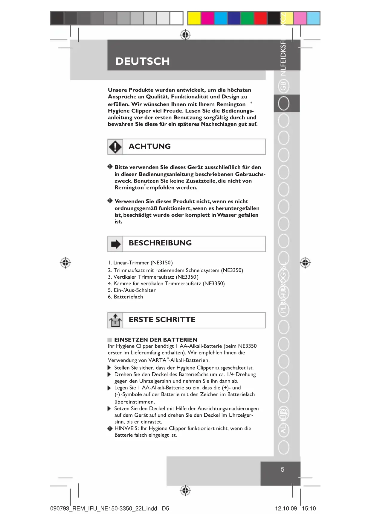 Hygiene Clipper viel Freude. Lesen Sie die Bedienungs-anleitung vor der ersten Benutzung sorgfältig durch und bewahren Sie diese für ein späteres Nachschlagen gut auf. ACHTUNG Bitte verwenden Sie dieses Gerät ausschließlich für den in dieser Bedienungsanleitung beschriebenen Gebrauchs-zweck. Benutzen Sie keine Zusatzteile, die nicht von Remington empfohlen werden. Verwenden Sie dieses Produkt nicht, wenn es nicht ordnungsgemäß funktioniert, wenn es heruntergefallen ist, beschädigt wurde oder komplett in Wasser gefallen ist. BESCHREIBUNG 1. Linear-Trimmer (NE3150)2. Trimmaufsatz mit rotierendem Schneidsystem (NE3350)3. Vertikaler Trimmeraufsatz (NE3350)4. Kämme für vertikalen Trimmeraufsatz (NE3350)5. Ein-/Aus-Schalter6. Batteriefach ERSTE SCHRITTE EINSETZEN DER BATTERIENIhr Hygiene Clipper benötigt 1 AA-Alkali-Batterie (beim NE3350 erster im Lieferumfang enthalten). Wir empfehlen Ihnen die Verwendung von VARTA -Alkali-Batterien. Stellen Sie sicher, dass der Hygiene Clipper ausgeschaltet ist. Drehen Sie den Deckel des Batteriefachs um ca. 1/4-Drehung gegen den Uhrzeigersinn und nehmen Sie ihn dann ab. Legen Sie 1 AA-Alkali-Batterie so ein, dass die (+)- und (-)-Symbole auf der Batterie mit den Zeichen im Batteriefach übereinstimmen. Setzen Sie den Deckel mit Hilfe der Ausrichtungsmarkierungenauf dem Gerät auf und drehen Sie den Deckel im Uhrzeiger-sinn, bis er einrastet.
