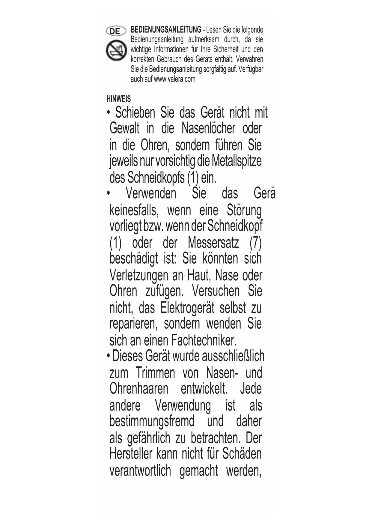 - Dieses Gerät wurde ausschließlich zum Trimmen von Nasen- und Ohrenhaaren entwickelt. Jede andere Verwendung ist als bestimmungsfremd und daher als gefährlich zu betrachten. Der Hersteller kann nicht für Schäden verantwortlich gemacht werden,