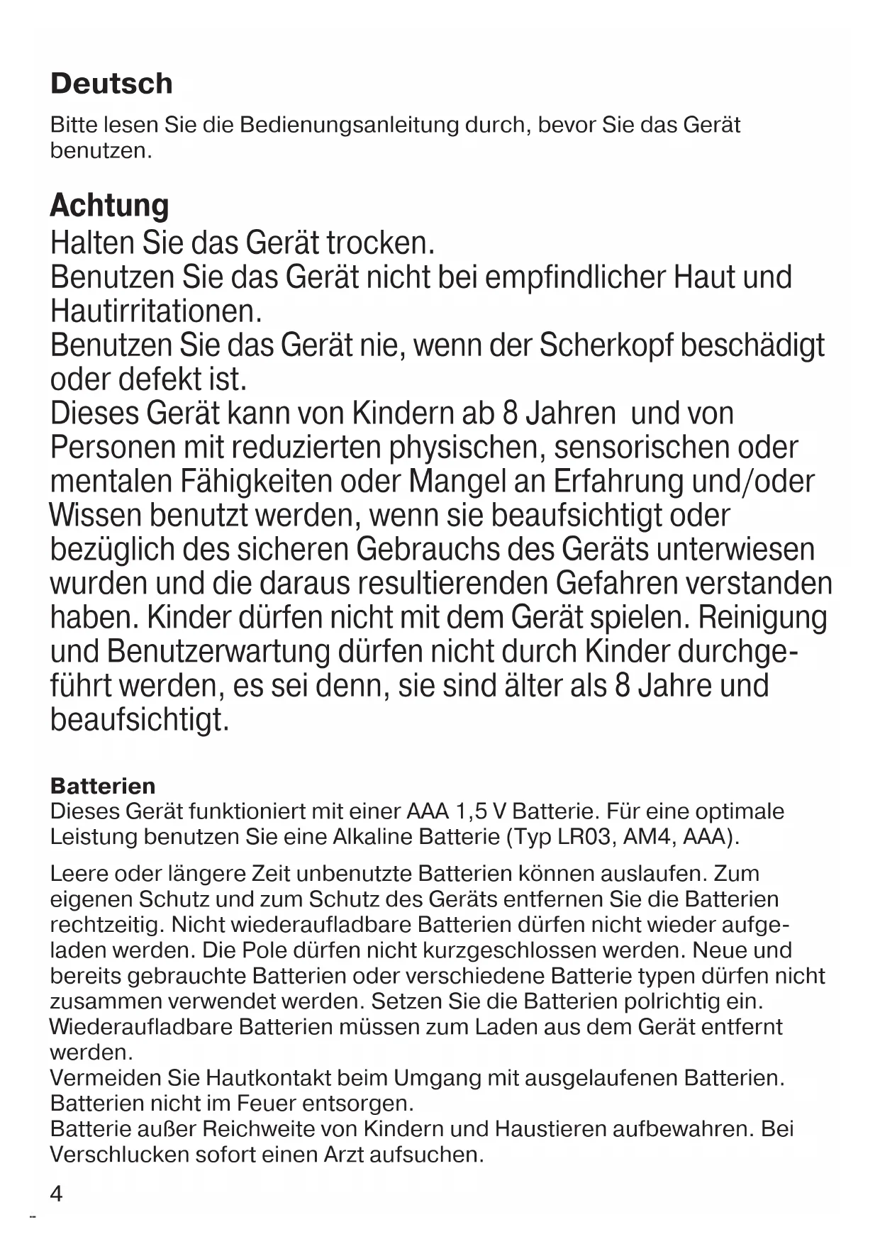 Leere oder länger Zeit unbenutzte Batterien konnen auslaufen. Zum eigenen Schutz und zum Schutz des Geräts entfern den Sie die Batterienrechtzeitig. Nicht wiederaufladbare Batterien)dürfen nicht wieder aufgeladen werden. Die Pole dürfen nicht kurzgeschlossen werden. Neue undbereits gebrauchte Batterien oder verschiedene Batterie typen dürfen nichtzusammen verwendet werden. Setzen Sie die Batterien polrlichtig ein. Wiederaufladbare Batterien,müssen zum Laden aus dem Gerät entfernt werden.
