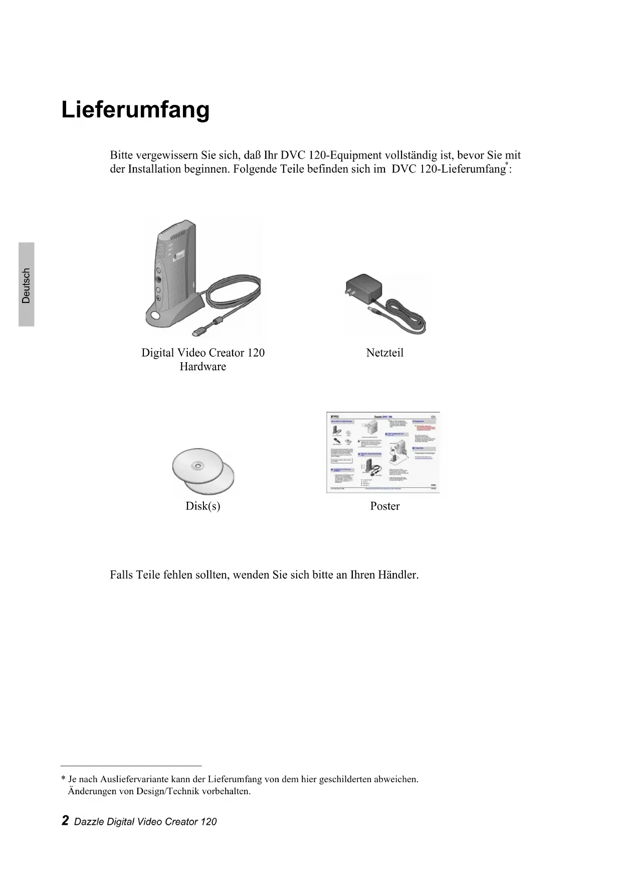software and select View Guided Tour.Dazzle Digital Video Creator 120 KURZANLEITUNG2 Dazzle Digital Video Creator 120 Deutsch Lieferumfang Bitte vergewissern Sie sich, daß Ihr DVC 120-Equipment vollständig ist, bevor Sie mit der Installation beginnen. Folgende Teile befinden sich im DVC 120-Lieferumfang