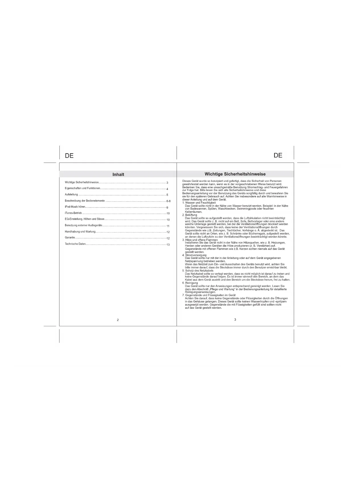iTunes-Betrieb Benutzung eines externen Audiosignals EQ-Einstellung, Höhen und Bässe Dieses Gerät verfügt über einen iTunes-Anschluss an der Rückseite des Geräts, mit dem Sie iTunes benutzen können, ohne den iPod von der Docking-Station zu entfernen. 1.Schließen Sie den Mini-USB-Stecker des USB-Kabels am Mini-USB-Anschluss an der Rückseite des Geräts an. 2.Verbinden Sie das andere Ende des USB-Kabels mit dem USB-Port Ihres Computers. 3.Achten Sie darauf, dass ein iPod angeschlossen ist und der iPod-Modus aktiviert ist. 4.Benutzen Sie iTunes auf Ihrem Computer wie gewohnt. Dieses Modell wird mit zwei Aux-Audiokabeln mit 3,5-mm-Steckern ausgeliefert (jeweils mit 1 und 1,5 m Länge). Wenn das Gerät sich im Bereitschaftsbetrieb befindet, leuchtet die rote Kontrolllampe auf. Betätigen Sie die POWER-Taste (STANDBY), um das Gerät einzuschalten und die Kontrolllampe leuchtet blau auf. Wenn die Kontrolllampe blau leuchtet, können Sie die POWER-Taste benutzen, um zwischen dem iPod- und AUX-IN-Modus umherzuschalten. 1.Schließen Sie das externe Audiogerät mit einem 3,5mm Audiokabel am LINE IN - Eingang an der Rückseite des Geräts an. 2.Schließen Sie das andere Ende des Kabels am LINE-Ausgang oder Kopfhöreranschluss des externen Audiogeräts an. 3.Schalten Sie das externe Audiogerät an. 4.Betätigen Sie die POWER-Taste zur Auswahl des AUX-IN-Modus. Überprüfen Sie, ob die Lautsprecherausgabe das Eingangssignal Ihres externen Audiogeräts wiedergibt und ob Sie den AUX-IN-Modus aktiviert haben. 5.Sie können das Lautstärkeniveau nun über die Lautstärketasten des Geräts einstellen. Alle anderen Funktionen können am externen Gerät wie gewohnt gesteuert werden. (1)Wenn Sie den LINE OUT-Ausgang des externen Geräts verwenden, können Sie die Lautstärke nur an diesem Audiosystem einstellen. Wenn Sie den Kopfhöreranschluss des externen Geräts verwenden, können Sie die Lautstärke sowohl am externen Gerät als auch am Audiosystem einstellen. (2)Betätigen Sie die POWER-Taste, um das Gerät nach der Benutzung auszuschalten (die Kontrolllampe leuchtet rot auf). Vergessen Sie dabei nicht das externe Gerät ebenfalls auszuschalten. Hinweis: Hinweis: (Hinweis: die folgenden Funktionen können nur über die Fernbedienung benutzt werden.) Höhen-Einstellung:Bass-Einstellung:Equalizer-Einstellung: -Betätigen Sie die TREBLE-Taste und Sie aktivieren den Höhen-Einstellungsmodus. Die Kontrolllampe blinkt abwechselnd in rosa und blau. -Während die Kontrolllampe blinkt (rosa/blau), benutzen Sie die VOL-Tasten, um die Höhen auf den gewünschten Pegel zu stellen. -Das Gerät verlässt den Höhen-Einstellungsmodus nach ein paar Sekunden automatisch und die Kontrolllampe leuchtet wieder blau. -Betätigen Sie die BASS-Taste und Sie aktivieren den Bass-Einstellungsmodus. Die Kontrolllampe blinkt abwechselnd in rosa und blau. -Während die Kontrolllampe blinkt (rosa/blau), benutzen Sie die VOL-Tasten, um die Bässe auf den gewünschten Pegel zu stellen. -Das Gerät verlässt den Bass-Einstellungsmodus nach ein paar Sekunden automatisch und die Kontrolllampe leuchtet wieder blau. -Das Gerät bietet Ihnen vier verschiedene EQ-Einstellungen zur Auswahl: Rock, Pop, Klassik, und Jazz. -Betätigen Sie die EQ-Taste, um den von Ihnen gewünschten EQ-Effekt zu wählen. -Halten Sie die EQ-Taste für ca. 2 Sekunden gedrückt, um die EQ-Funktion zu deaktivieren. Hinweis: Wenn ein EQ-Effekt aktiviert ist, werden die Höhen- und Bass-Einstellungen deaktiviert.