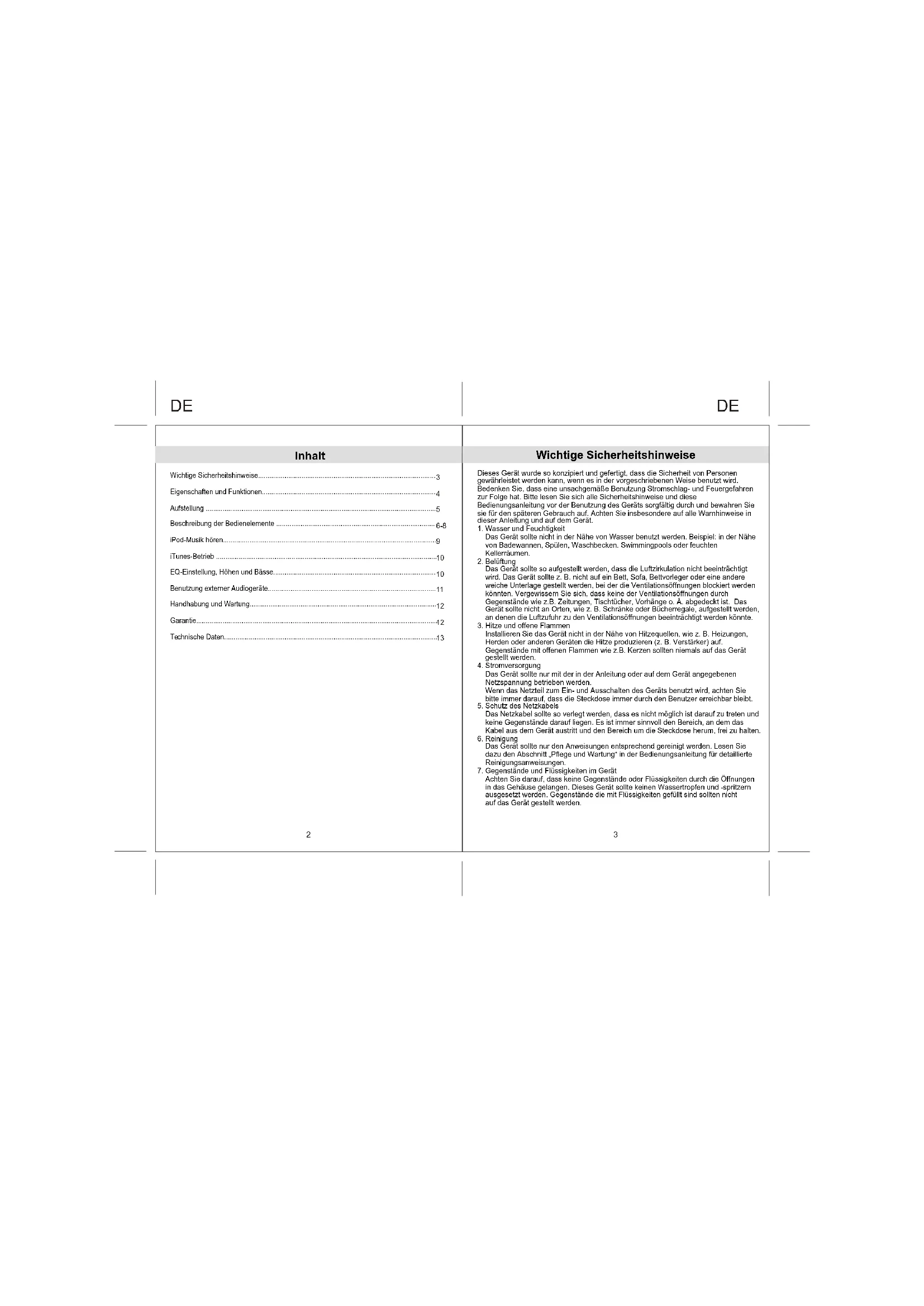 Achten Sie darauf, dass keine Gegenstände oder Flüssigkeiten durch die Öffnungen in das Gehäuse gelangen. Dieses Gerät sollte keinen Wassertropfen und -spritzern ausgesetzt werden. Gegenstände die mit Flüssigkeiten gefüllt sind sollten nicht auf das Gerät gestellt werden. DEAufstellung Eigenschaften und Funktionen