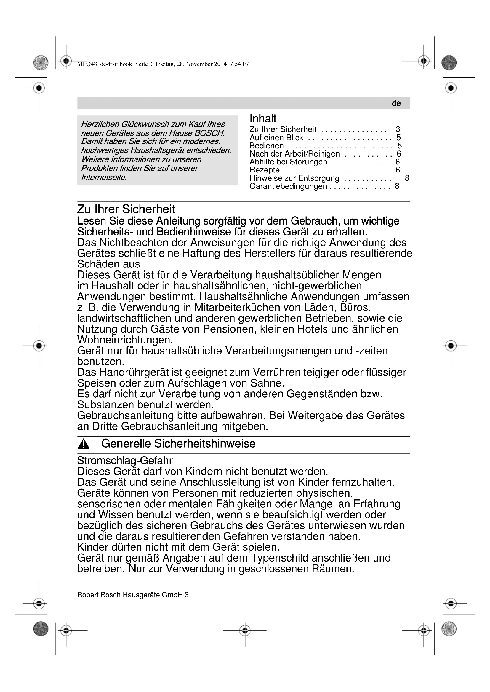 - MFQ48_de-fr-it.book Seite 2 Freitag, 28. November 2014 7:54 073Robert Bosch Hausgeräte GmbH 3 Inhalt Zu Ihrer Sicherheit p. 3