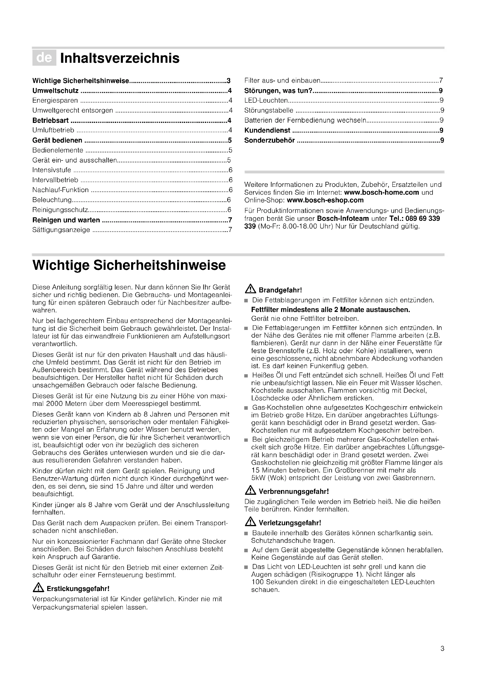 - Sonderzubehör Produktinfo Weitere Informationen zu Produkten, Zubehör, Ersatzteilen und Services finden Sie im Internet: www.bosch-home.com und Online-Shop: www.bosch-eshop.com Für Produktinformationen sowie Anwendungs- und Bedienungs- fragen berät Sie unser Bosch-Infoteam unter Tel.: 089 69 339 339 (Mo-Fr: 8.00-18.00 Uhr) Nur für Deutschland gültig. Wichtige Sicherheitshinweise Diese Anleitung sorgfältig lesen. Nur dann können Sie Ihr Gerät sicher und richtig bedienen. Die Gebrauchs- und Montageanlei- tung für einen späteren Gebrauch oder für Nachbesitzer aufbe- wahren. Nur bei fachgerechtem Einbau entsprechend der Montageanlei- tung ist die Sicherheit beim Gebrauch gewährleistet. Der Instal- lateur ist für das einwandfreie Funktionieren am Aufstellungsort verantwortlich. Dieses Gerät ist nur für den privaten Haushalt und das häusli- che Umfeld bestimmt. Das Gerät ist nicht für den Betrieb im Außenbereich bestimmt. Das Gerät während des Betriebes beaufsichtigen. Der Hersteller haftet nicht für Schäden durch unsachgemäßen Gebrauch oder falsche Bedienung. Dieses Gerät ist für eine Nutzung bis zu einer Höhe von maxi- mal 2000 Metern über dem Meeresspiegel bestimmt. Dieses Gerät kann von Kindern ab 8 Jahren und Personen mit reduzierten physischen, sensorischen oder mentalen Fähigkei- ten oder Mangel an Erfahrung oder Wissen benutzt werden, wenn sie von einer Person, die für ihre Sicherheit verantwortlich ist, beaufsichtigt oder von ihr bezüglich des sicheren Gebrauchs des Gerätes unterwiesen wurden und sie die dar- aus resultierenden Gefahren verstanden haben. Kinder dürfen nicht mit dem Gerät spielen. Reinigung und Benutzer-Wartung dürfen nicht durch Kinder durchgeführt wer- den, es sei denn, sie sind 15 Jahre und älter und werden beaufsichtigt. Kinder jünger als 8 Jahre vom Gerät und der Anschlussleitung fernhalten. Das Gerät nach dem Auspacken prüfen. Bei einem Transport- schaden nicht anschließen. Nur ein konzessionierter Fachmann darf Geräte ohne Stecker anschließen. Bei Schäden durch falschen Anschluss besteht kein Anspruch auf Garantie. Dieses Gerät ist nicht für den Betrieb mit einer externen Zeit- schaltuhr oder einer Fernsteuerung bestimmt. : Erstickungsgefahr! Verpackungsmaterial ist für Kinder gefährlich. Kinder nie mit Verpackungsmaterial spielen lassen. : Brandgefahr! ■ Die Fettablagerungen im Fettfilter können sich entzünden. Fettfilter mindestens alle 2 Monate austauschen. Gerät nie ohne Fettfilter betreiben. Brandgefahr!■ Die Fettablagerungen im Fettfilter können sich entzünden. In der Nähe des Gerätes nie mit offener Flamme arbeiten (z.B. flambieren). Gerät nur dann in der Nähe einer Feuerstätte für feste Brennstoffe (z.B. Holz oder Kohle) installieren, wenn eine geschlossene, nicht abnehmbare Abdeckung vorhanden ist. Es darf keinen Funkenflug geben. Brandgefahr!■ Heißes Öl und Fett entzündet sich schnell. Heißes Öl und Fett nie unbeaufsichtigt lassen. Nie ein Feuer mit Wasser löschen. Kochstelle ausschalten. Flammen vorsichtig mit Deckel, Löschdecke oder Ähnlichem ersticken. Brandgefahr!■ Gas-Kochstellen ohne aufgesetztes Kochgeschirr entwickeln im Betrieb große Hitze. Ein darüber angebrachtes Lüftungs- gerät kann beschädigt oder in Brand gesetzt werden. Gas- Kochstellen nur mit aufgesetztem Kochgeschirr betreiben. Brandgefahr!■ Bei gleichzeitigem Betrieb mehrerer Gas-Kochstellen entwi- ckelt sich große Hitze. Ein darüber angebrachtes Lüftungsge- rät kann beschädigt oder in Brand gesetzt werden. Zwei Gaskochstellen nie gleichzeitig mit größter Flamme länger als 15 Minuten betreiben. Ein Großbrenner mit mehr als 5kW (Wok) entspricht der Leistung von zwei Gasbrennern. : Verbrennungsgefahr! Die zugänglichen Teile werden im Betrieb heiß. Nie die heißen Teile berühren. Kinder fernhalten. : Verletzungsgefahr! ■ Bauteile innerhalb des Gerätes können scharfkantig sein. Schutzhandschuhe tragen. Verletzungsgefahr!■ Auf dem Gerät abgestellte Gegenstände können herabfallen. Keine Gegenstände auf das Gerät stellen. Verletzungsgefahr!■ Das Licht von LED-Leuchten ist sehr grell und kann die Augen schädigen (Risikogruppe 1). Nicht länger als 100 Sekunden direkt in die eingeschalteten LED-Leuchten schauen.4 : Stromschlaggefahr! ■ Ein defektes Gerät kann einen Stromschlag verursachen. Nie ein defektes Gerät einschalten. Netzstecker ziehen oder Sicherung im Sicherungskasten ausschalten. Kundendienst rufen. Stromschlaggefahr! ■ Unsachgemäße Reparaturen sind gefährlich. Nur ein von uns geschulter Kundendienst-Techniker darf Reparaturen durch- führen und beschädigte Anschlussleitungen austauschen. Ist das Gerät defekt, Netzstecker ziehen oder Sicherung im Sicherungskasten ausschalten. Kundendienst rufen. Stromschlaggefahr! ■ Eindringende Feuchtigkeit kann einen Stromschlag verursa- chen. Keinen Hochdruckreiniger oder Dampfreiniger verwen- den. Ursachen für Schäden Achtung! Beschädigungsgefahr durch Korrosionsschäden. Gerät beim Kochen immer einschalten, um Kondenswasserbildung zu ver- meiden. Kondenswasser kann zu Korrosionsschäden führen. Beschädigungsgefahr durch eindringende Nässe in die Elektro- nik. Bedienelemente nie mit nassem Tuch reinigen. Oberflächenbeschädigung durch falsche Reinigung. Edel- stahlflächen nur in Schliffrichtung reinigen. Für Bedienelemente keinen Edelstahlreiniger verwenden. Oberflächenbeschädigung durch scharfe oder scheuernde Rei- nigungsmittel. Scharfe und scheuernde Reinigungsmittel nie verwenden. Beschädigungsgefahr durch Kondensat-Rücklauf. Abluftkanal vom Gerät aus leicht abfallend installieren (1° Gefälle). Umweltschutz Ihr neues Gerät ist besonders energieeffizient. Hier erhalten Sie Tipps, wie Sie beim Umgang mit Ihrem Gerät noch mehr Ener- gie sparen können und wie Sie das Gerät richtig entsorgen. Energiesparen ■ Beim Kochen ausreichend Zuluft sicherstellen, damit die Dunstabzugshaube effizient und mit 