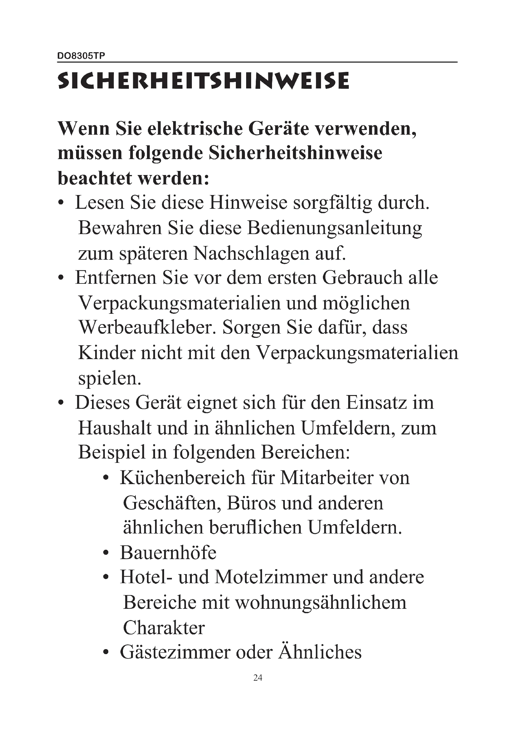 - Diese Gerät darf von Kindern ab 16 Jahren und Menschen mit körperlichen oder sensorischen Behinderungen oder Menschen mit eingeschränkten geistigen Fähigkeiten oder mangelnder Erfahrung bzw. Sachkenntnis unter der Bedingung verwendet werden, dass diese Personen beaufsichtigt werden oder sie eine Anleitung zur sicheren Verwendung des Geräts erhalten haben und sich der Gefahren bei der Verwendung des Geräts bewusst sind. Kinder dürfen nicht mit dem Gerät spielen. Die Wartung undDO8305TP