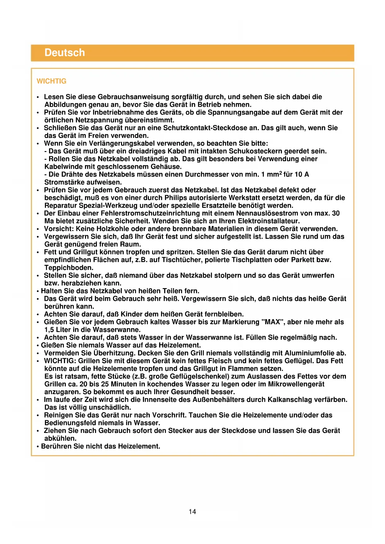- Reinigen Sie das Gerät nur nach Vorschrift. Tauchen Sie die Heizelemente und/oder das Bedienungsfeld niemals in Wasser.