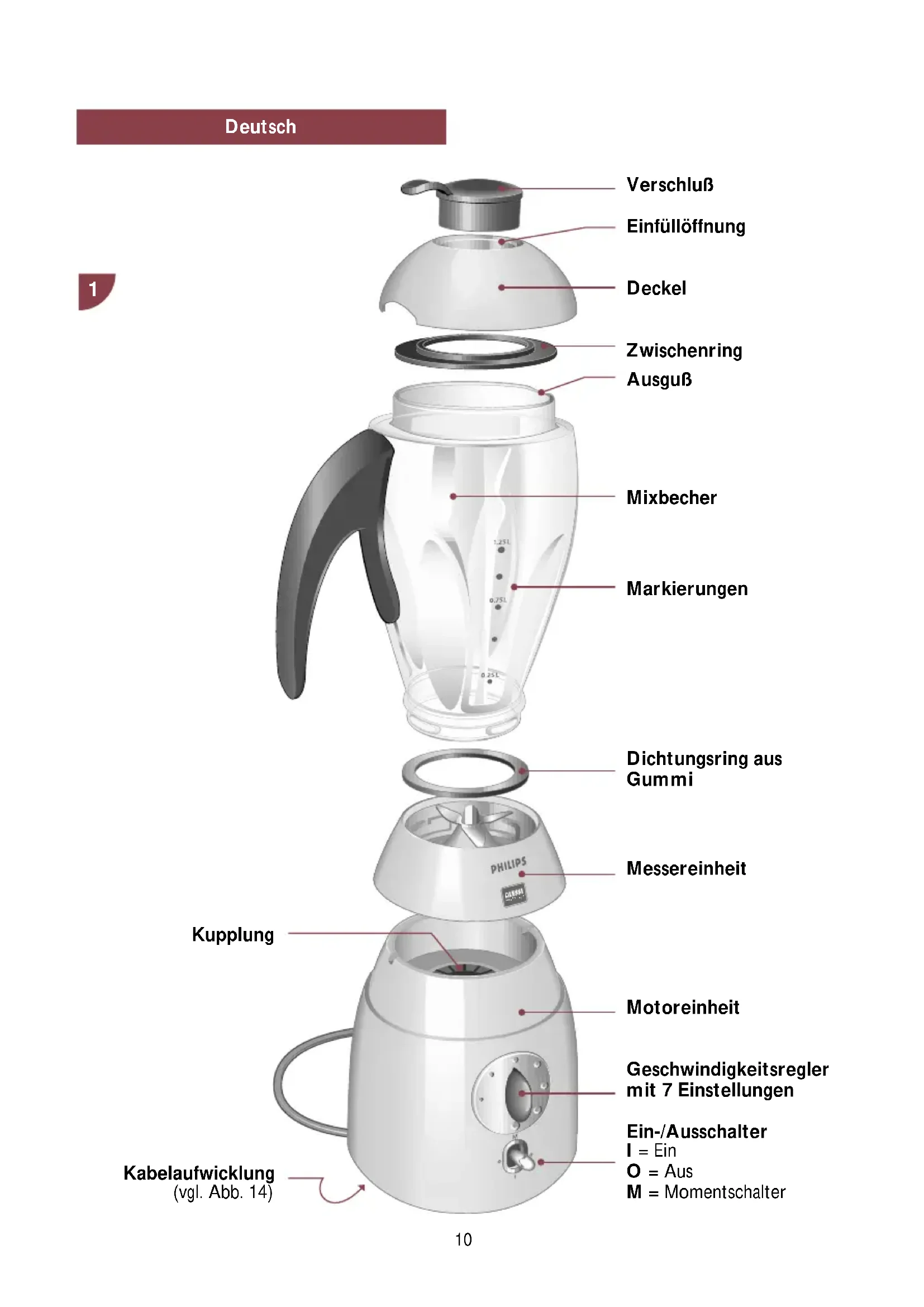 Verschluß Einfüllöffnung Deckel Zwischenring Ausguß Mixbecher Markierungen Dichtungsring aus Gummi Messereinheit Kupplung Motoreinheit Geschwindigkeitsregler mit 7 Einstellungen Ein-/Ausschalter I = Ein O = Aus M = Momentschalter Kabelaufwicklung (vgl. Abb. 14)Philips und Alessi haben gemeinsam eine Einheit von elektrischen Hausgeräten entwickelt - einzigartig in Form und Funktion. Dieses Jubiläumsmodell ergänzt die erfolgreiche Produktlinie von Philips-Alessi aus Toaster, Kaffeeautomat, Wasserkessel und Zitruspresse um ein Mixgerät.