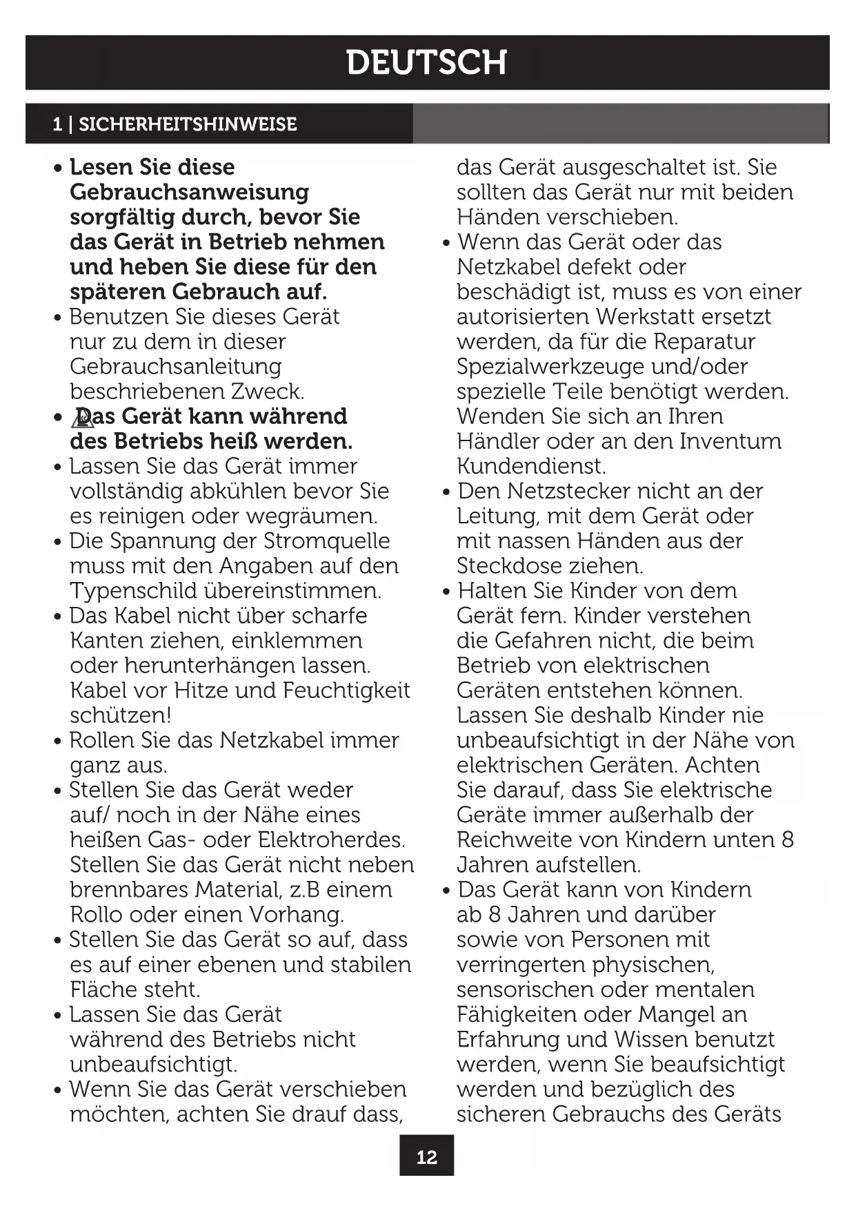- Das Gerät kann von Kindern ab 8 Jahren und darüber sowie von Personen mit verringerten physischen, sensorischen oder mentalen Fähigkeiten oder Mangel an Erfahrung und Wissen benutzt werden, wenn Sie beaufsichtigt werden und bezüglich des sicheren Gebrauchs des Geräts 1 | SICHERHEITSHINWEISE
