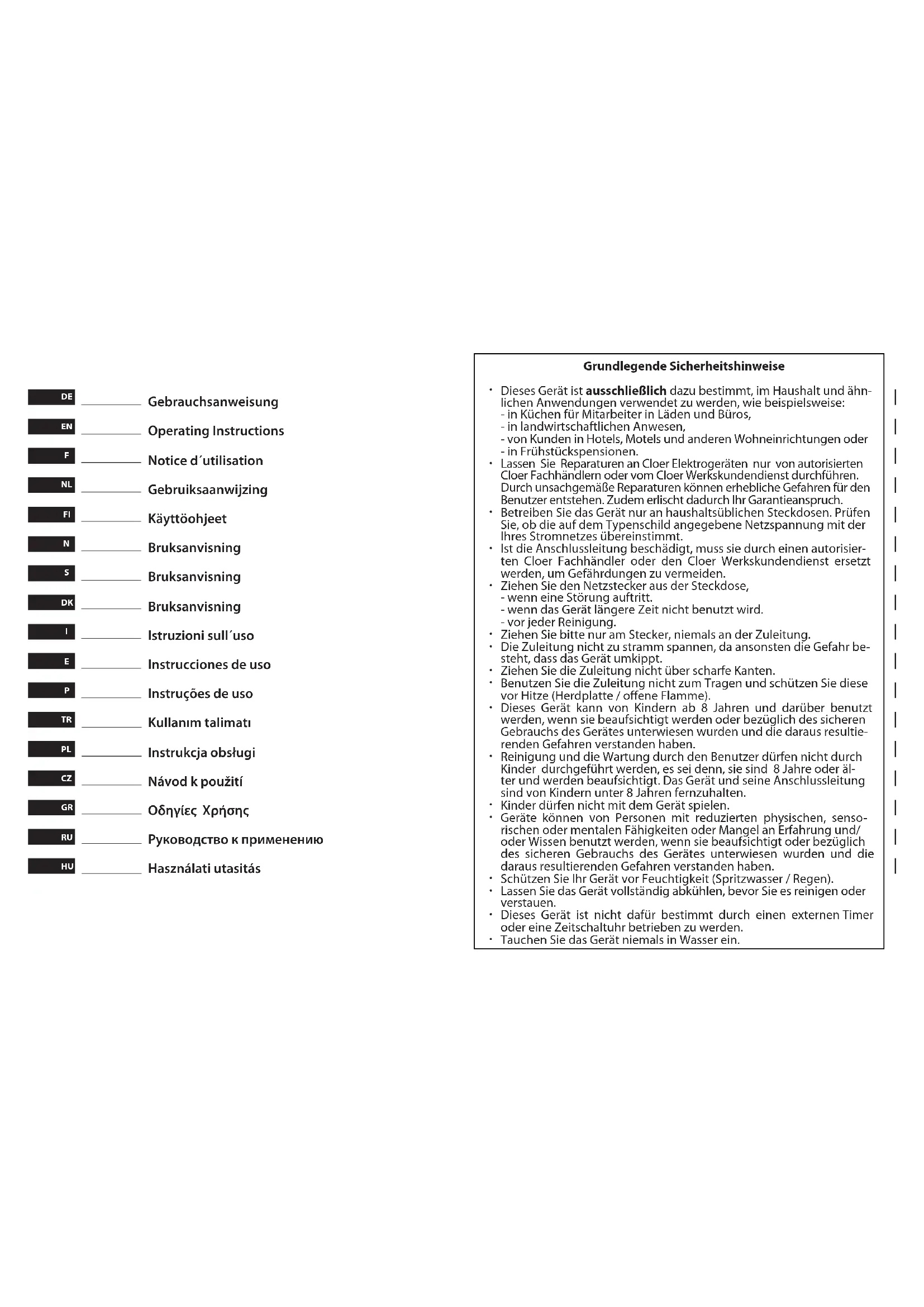 - Ist die Anschlussleitung beschädigt, muss sie durch einen autorisierten Cloer Fachhandlern oder den Cloer Werkskundendienst ersetzt werden, um Gefahrdnungen zu vermeiden.
