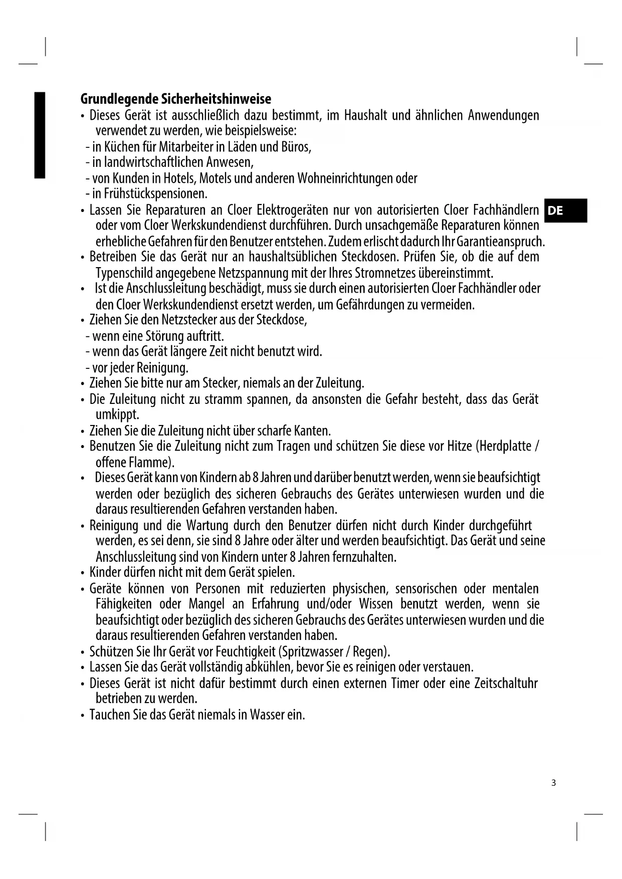 - Ist die Anschlussleitung beschädigt, muss sie durch einen autorisierten Cloer Fachhändler oder den Cloer Werkskundendienst ersetzt werden, um Gefährdungen zu vermeiden.