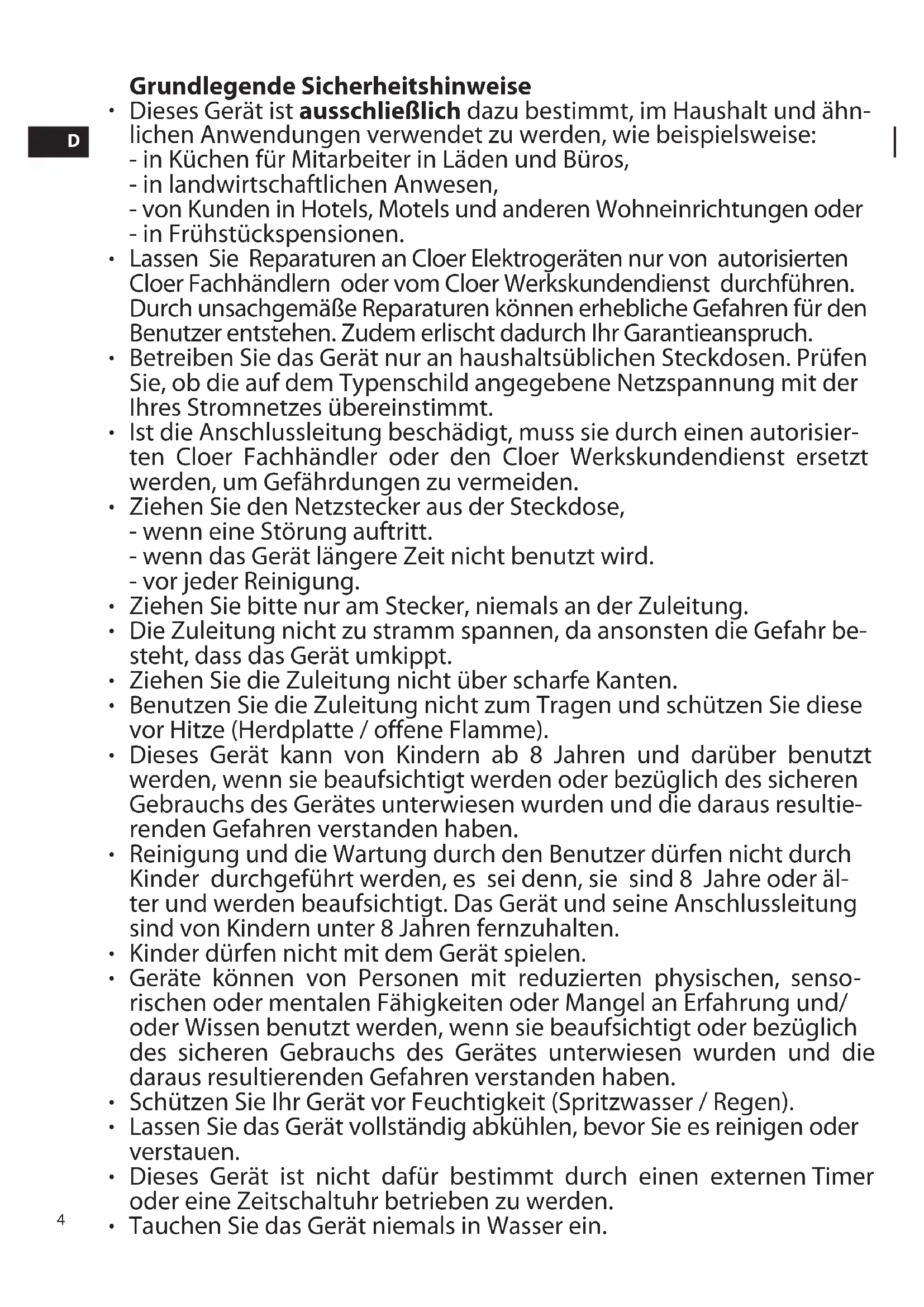 Grundlegende Sicherheitshinweise Dieses Gerät ist ausschließlich dazu bestimmt, im Haushalt und ähn- lichen Anwendungen verwendet zu werden, wie beispielsweise: - in Küchen für Mitarbeiter in Läden und Büros, - in landwirtschaftlichen Anwesen, - von Kunden in Hotels, Motels und anderen Wohneinrichtungen oder - in Frühstückspensionen. Lassen Sie Reparaturen an Cloer Elektrogeräten nur von autorisierten Cloer Fachhändlern oder vom Cloer Werkskundendienst durchführen. Durch unsachgemäße Reparaturen können erhebliche Gefahren für den Benutzer entstehen. Zudem erlischt dadurch Ihr Garantieanspruch. Betreiben Sie das Gerät nur an haushaltsüblichen Steckdosen. Prüfen Sie, ob die auf dem Typenschild angegebene Netzspannung mit der Ihres Stromnetzes übereinstimmt. Ist die Anschlussleitung beschädigt, muss sie durch einen autorisier- ten Cloer Fachhändler oder den Cloer Werkskundendienst ersetzt werden, um Gefährdungen zu vermeiden. Ziehen Sie den Netzstecker aus der Steckdose, - wenn eine Störung auftritt. - wenn das Gerät längere Zeit nicht benutzt wird. - vor jeder Reinigung. Ziehen Sie bitte nur am Stecker, niemals an der Zuleitung. Die Zuleitung nicht zu stramm spannen, da ansonsten die Gefahr be- steht, dass das Gerät umkippt. Ziehen Sie die Zuleitung nicht über scharfe Kanten. Benutzen Sie die Zuleitung nicht zum Tragen und schützen Sie diese vor Hitze (Herdplatte / offene Flamme). Dieses Gerät kann von Kindern ab 8 Jahren und darüber benutzt werden, wenn sie beaufsichtigt werden oder bezüglich des sicheren Gebrauchs des Gerätes unterwiesen wurden und die daraus resultie- renden Gefahren verstanden haben. Reinigung und die Wartung durch den Benutzer dürfen nicht durch Kinder durchgeführt werden, es sei denn, sie sind 8 Jahre oder äl- ter und werden beaufsichtigt. Das Gerät und seine Anschlussleitung sind von Kindern unter 8 Jahren fernzuhalten. Kinder dürfen nicht mit dem Gerät spielen. Geräte können von Personen mit reduzierten physischen, senso- rischen oder mentalen Fähigkeiten oder Mangel an Erfahrung und/ oder Wissen benutzt werden, wenn sie beaufsichtigt oder bezüglich des sicheren Gebrauchs des Gerätes unterwiesen wurden und die daraus resultierenden Gefahren verstanden haben. Schützen Sie Ihr Gerät vor Feuchtigkeit (Spritzwasser / Regen). Lassen Sie das Gerät vollständig abkühlen, bevor Sie es reinigen oder verstauen. Dieses Gerät ist nicht dafür bestimmt durch einen externen Timer oder eine Zeitschaltuhr betrieben zu werden. Tauchen Sie das Gerät niemals in Wasser ein.