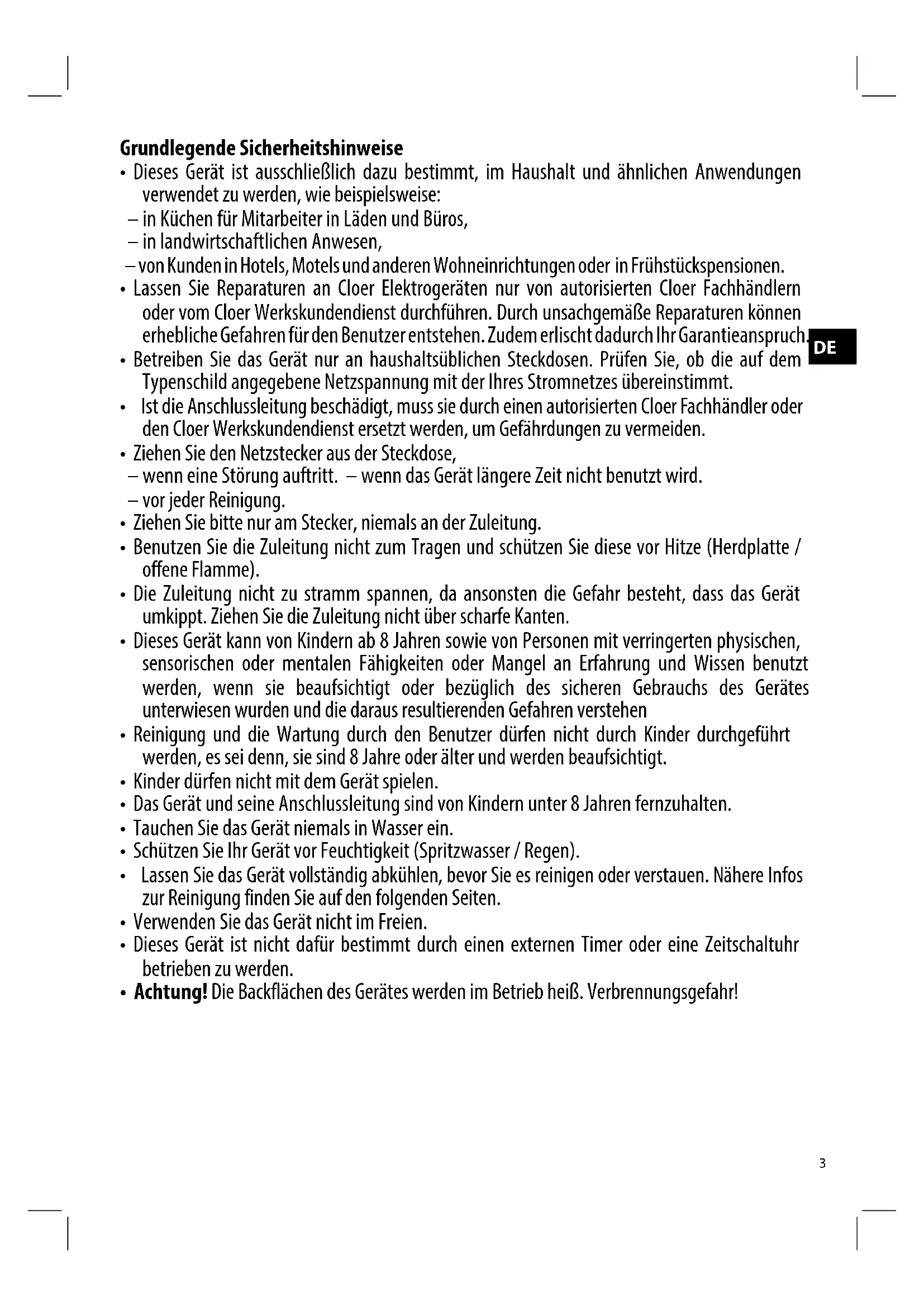 - Ist die Anschlussleitung beschädigt, muss sie durch einen autorisierten Cloer Fachhändler oder den Cloer Werkskundendienst ersetzt werden, um Gefährdungen zu vermeiden.