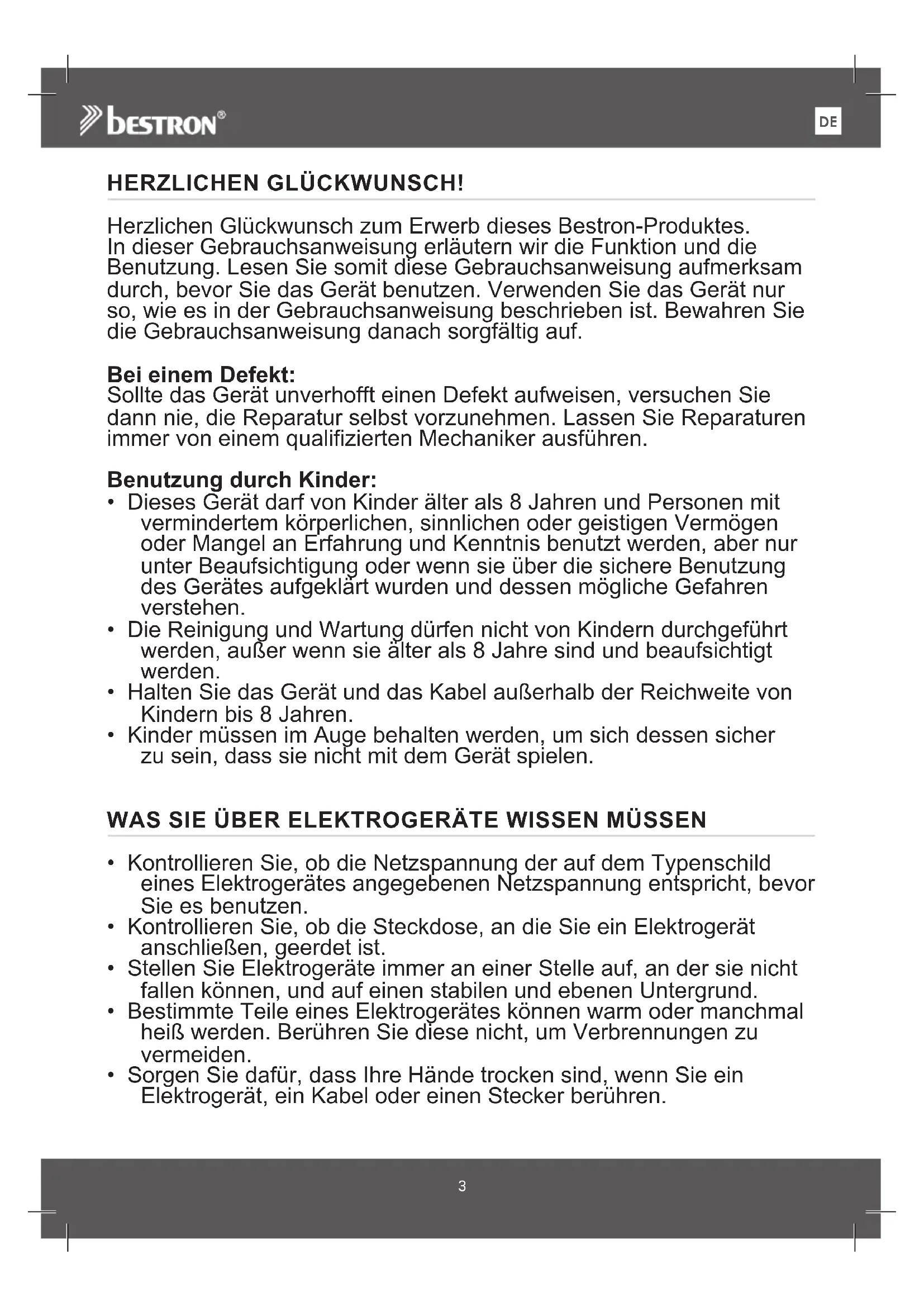 ESHERZLICHEN GLÜCKWUNSCH! Herzlichen Glückwunsch zum Erwerb dieses Bestron-Produktes. In dieser Gebrauchsanweisung erläutern wir die Funktion und die Benutzung. Lesen Sie somit diese Gebrauchsanweisung aufmerksam durch, bevor Sie das Gerät benutzen. Verwenden Sie das Gerät nur so, wie es in der Gebrauchsanweisung beschrieben ist. Bewahren Sie die Gebrauchsanweisung danach sorgfältig auf. Bei einem Defekt: Sollte das Gerät unverhofft einen Defekt aufweisen, versuchen Sie dann nie, die Reparatur selbst vorzunehmen. Lassen Sie Reparaturen immer von einem qualifizierten Mechaniker ausführen. Benutzung durch Kinder: