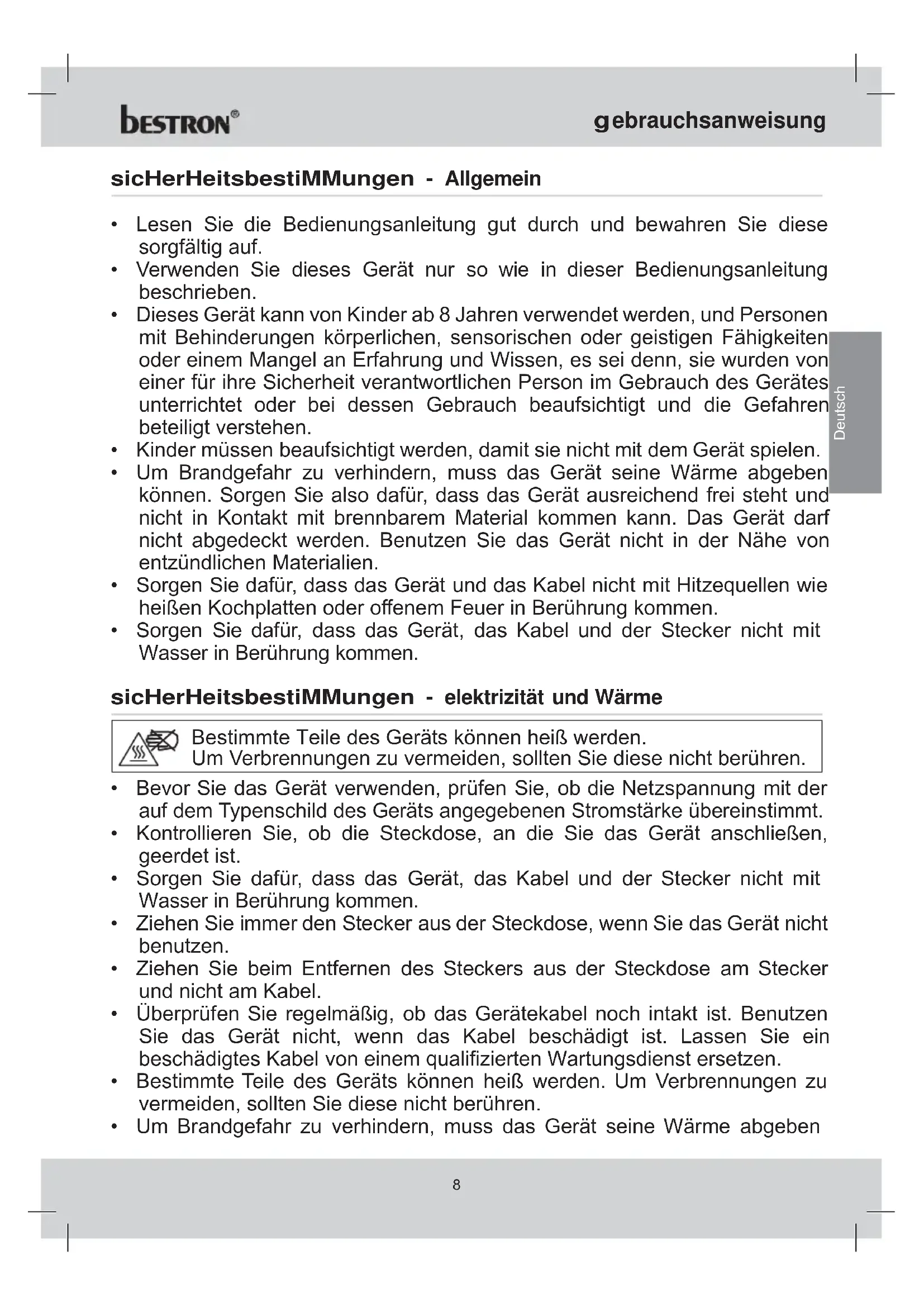 Finden Sie kostenlos die Bedienungsanleitung des Geräts DUE40028 BESTRON als PDF.