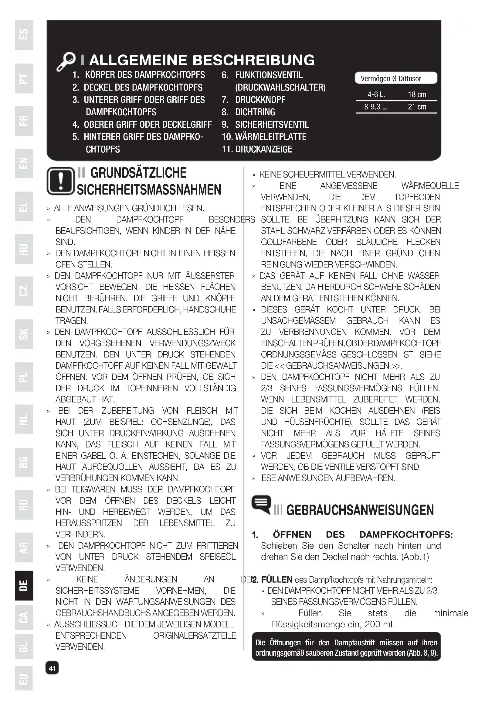 SEINES FASSUNGSVERMÖGENS FÜLLEN. » Füllen Sie stets die minimale Flüssigkeitsmenge ein, 200 ml. Die Öffnungen für den Dampfaustritt müssen auf ihren ordnungsgemäß sauberen Zustand geprüft werden (Abb. 8, 9). Vermögen Ø Diffusor4-6 L.8-9,3 L.18 cm21 cm » ALLE ANWEISUNGEN GRÜNDLICH LESEN.