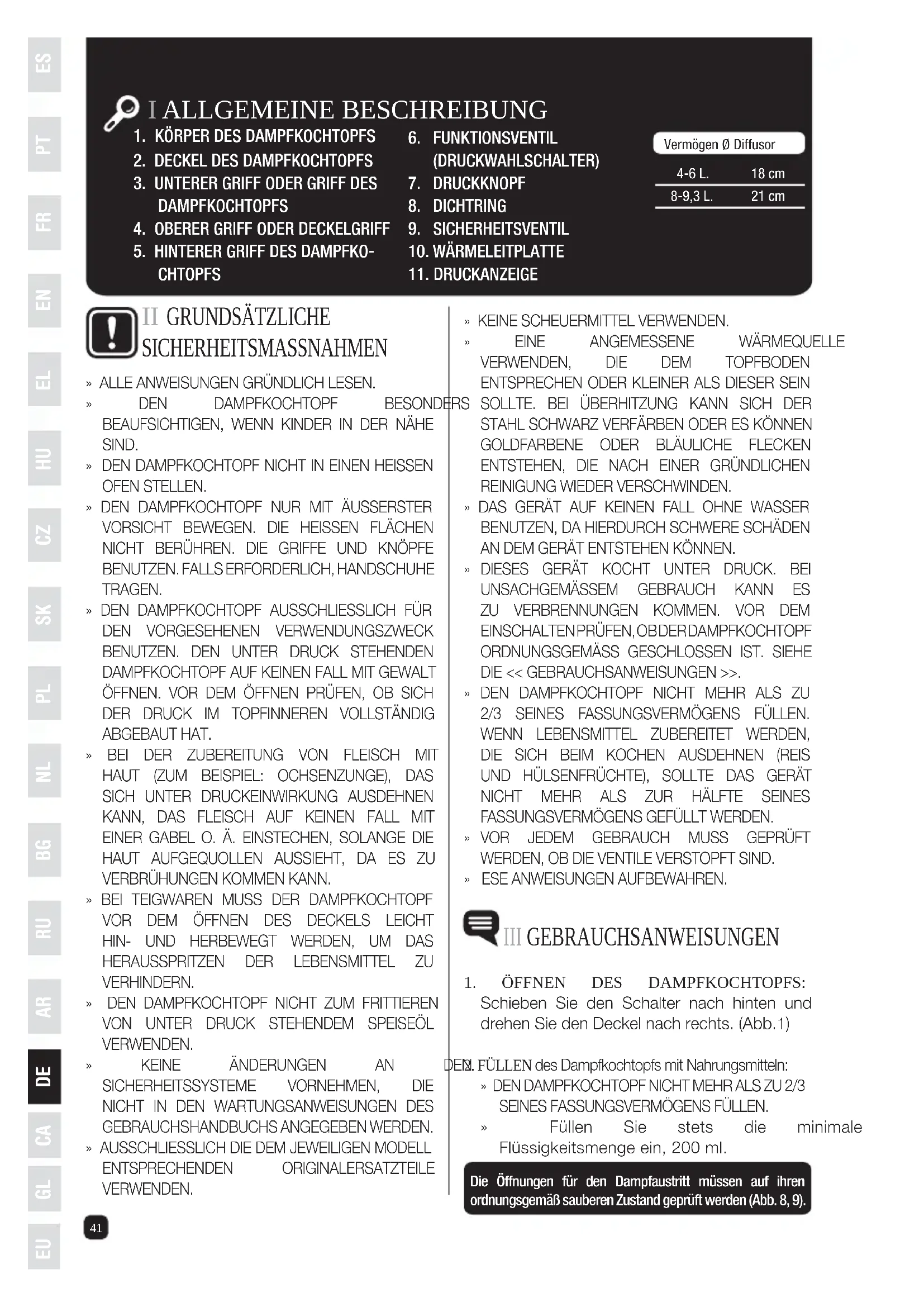 SEINES FASSUNGSVERMÖGENS FÜLLEN. » Füllen Sie stets die minimale Flüssigkeitsmenge ein, 200 ml. Die Öffnungen für den Dampfaustritt müssen auf ihren ordnungsgemäß sauberen Zustand geprüft werden (Abb. 8, 9). Vermögen Ø Diffusor4-6 L.8-9,3 L.18 cm21 cm » ALLE ANWEISUNGEN GRÜNDLICH LESEN.
