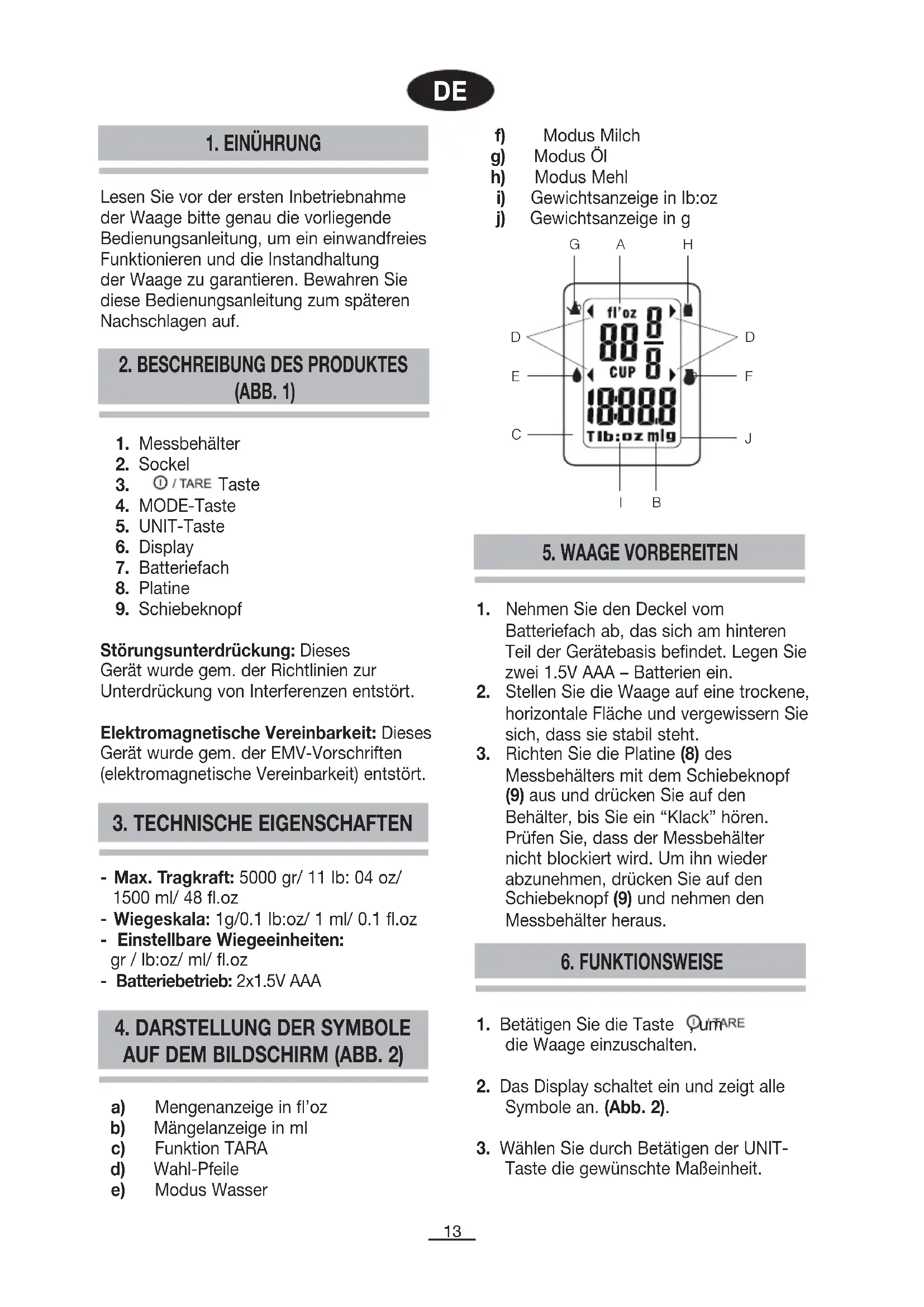 JFühren Sie in diesem Fall erneut die Schritte zum Vorbereiten der Waage aus. Bitte denken Sie daran, dass Batterien kein Hausmüll sind. Geben Sie die verbrauchten Batterien in speziell dafür vorgesehenen Behälter.