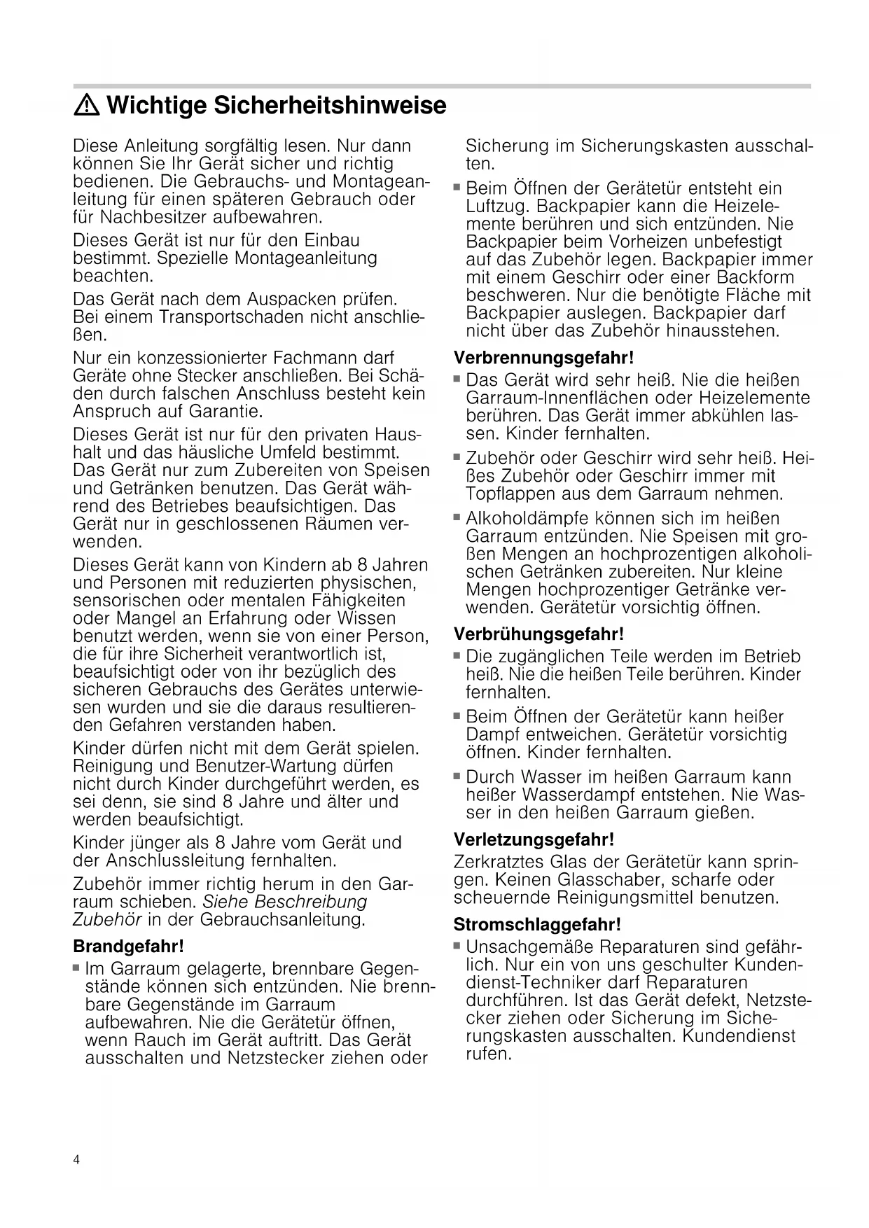 Durch Wasser im heißen Garraum kann heißer Wasserdampf entstehen. Nie Was- ser in den heißen Garraum gießen. Verletzungsgefahr! Zerkratztes Glas der Gerätetür kann sprin- gen. Keinen Glasschaber, scharfe oder scheuernde Reinigungsmittel benutzen. Stromschlaggefahr!
