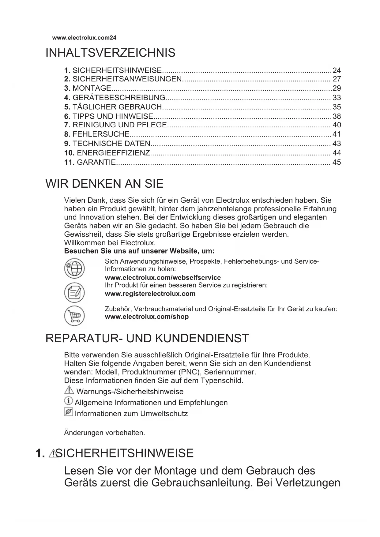 Lesen Sie vor der Montage und dem Gebrauch des Geräts zuerst die Gebrauchsanleitung. Bei Verletzungen www.electrolux.com24oder Schäden infolge nicht ordnungsgemäßer Montage oder Verwendung des Geräts übernimmt der Hersteller keine Haftung. Bewahren Sie die Anleitung immer an einem sicheren und zugänglichen Ort zum späteren Nachschlagen auf.