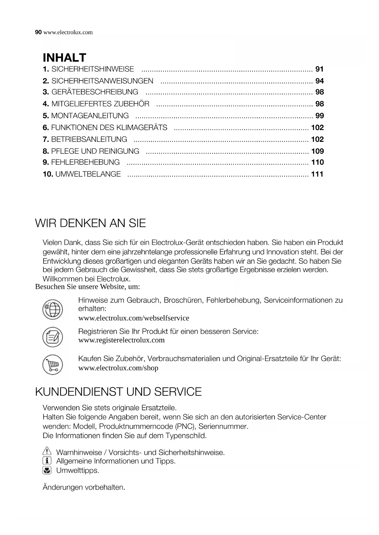 Vielen Dank, dass Sie sich für ein Electrolux-Gerät entschieden haben. Sie haben ein Produkt gewählt, hinter dem eine jahrzehntelange professionelle Erfahrung und Innovation steht. Bei der Entwicklung dieses großartigen und eleganten Geräts haben wir an Sie gedacht. So haben Sie bei jedem Gebrauch die Gewissheit, dass Sie stets großartige Ergebnisse erzielen werden. Willkommen bei Electrolux. Verwenden Sie stets originale Ersatzteile. Halten Sie folgende Angaben bereit, wenn Sie sich an den autorisierten Service-Center wenden: Modell, Produktnummerncode (PNC), Seriennummer. Die Informationen finden Sie auf dem Typenschild. Änderungen vorbehalten. Warnhinweise / Vorsichts- und Sicherheitshinweise. Allgemeine Informationen und Tipps. Umwelttipps. Hinweise zum Gebrauch, Broschüren, Fehlerbehebung, Serviceinformationen zu erhalten: www.electrolux.com/webselfservice Besuchen Sie unsere Website, um: Registrieren Sie Ihr Produkt für einen besseren Service: www.registerelectrolux.com Kaufen Sie Zubehör, Verbrauchsmaterialien und Original-Ersatzteile für Ihr Gerät: www.electrolux.com/shop INHALT