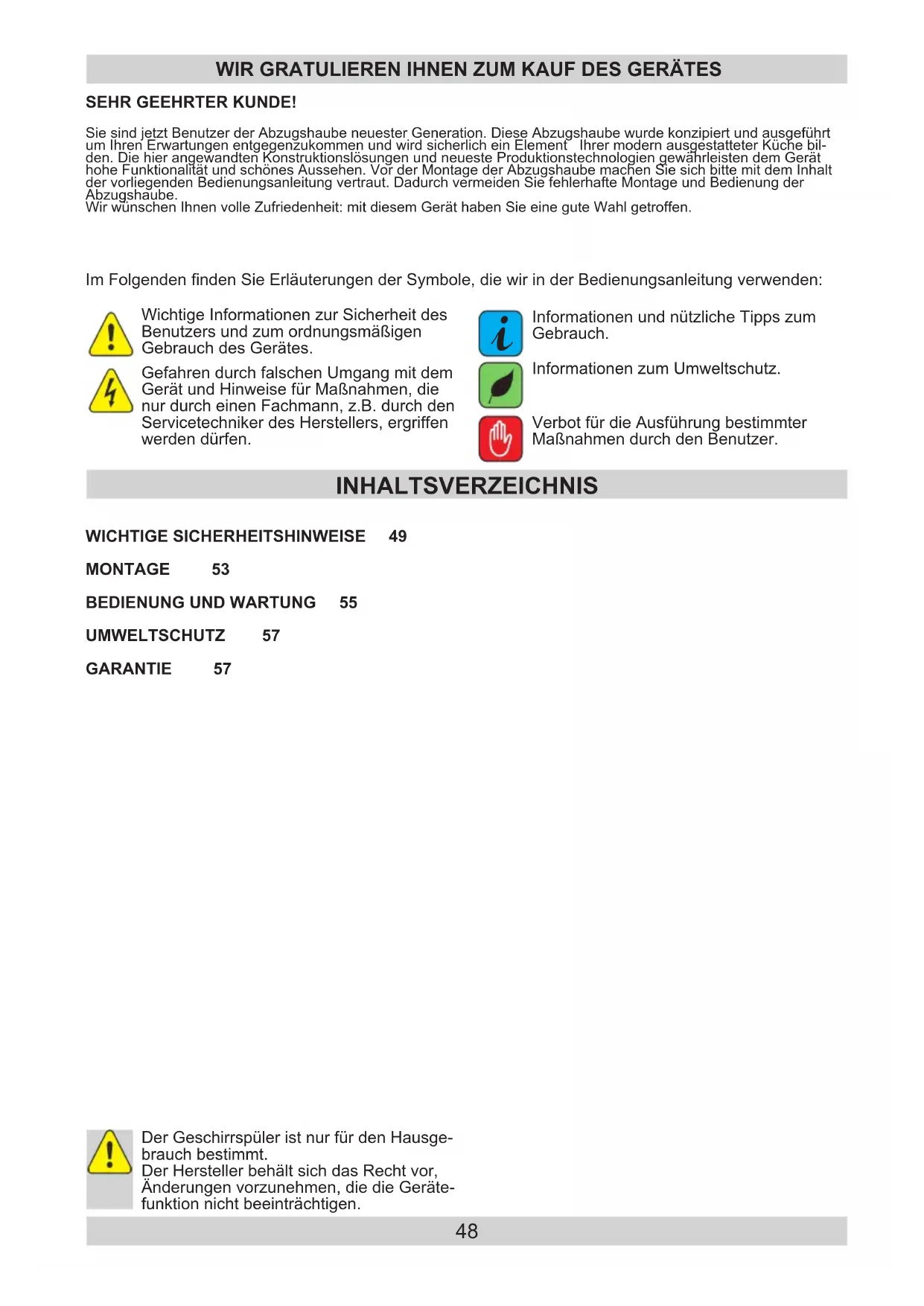 INHALTSVERZEICHNIS SEHR GEEHRTER KUNDE! Sie sind jetzt Benutzer der Abzugshaube neuester Generation. Diese Abzugshaube wurde konzipiert und ausgeführt um Ihren Erwartungen entgegenzukommen und wird sicherlich ein Element Ihrer modern ausgestatteter Küche bil- den. Die hier angewandten Konstruktionslösungen und neueste Produktionstechnologien gewährleisten dem Gerät hohe Funktionalität und schönes Aussehen. Vor der Montage der Abzugshaube machen Sie sich bitte mit dem Inhalt der vorliegenden Bedienungsanleitung vertraut. Dadurch vermeiden Sie fehlerhafte Montage und Bedienung der Abzugshaube.Wir wünschen Ihnen volle Zufriedenheit: mit diesem Gerät haben Sie eine gute Wahl getroffen. WIR GRATULIEREN IHNEN ZUM KAUF DES GERÄTES WICHTIGE SICHERHEITSHINWEISE 49 MONTAGE 53