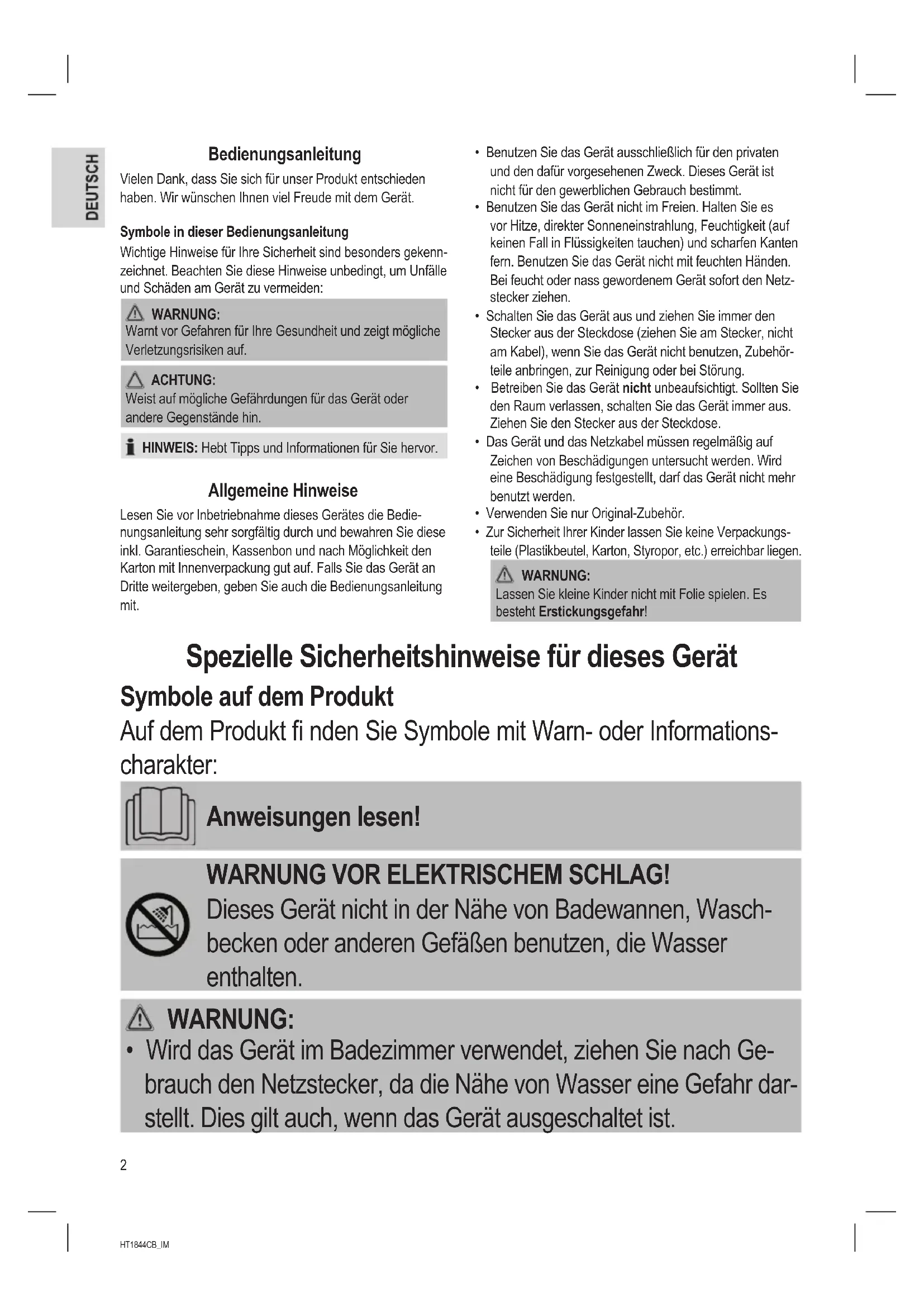 - Wird das Gerät im Badezimmer verwendet, ziehen Sie nach Ge- brauch den Netzstecker, da die Nähe von Wasser eine Gefahr dar- stellt. Dies gilt auch, wenn das Gerät ausgeschaltet ist.3 HT1844CB_IM 28.01.16 WARNUNG:
