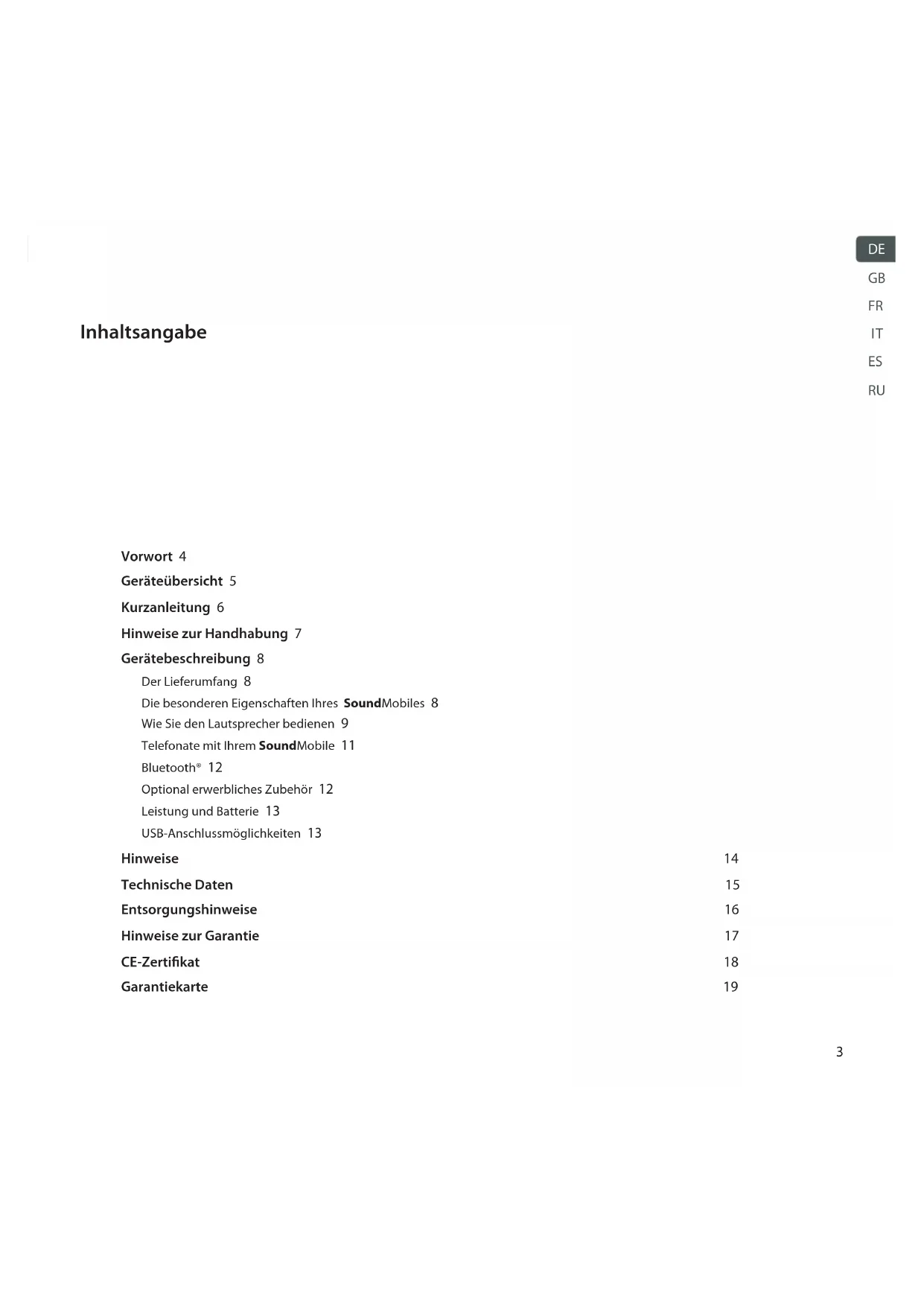water resistant3 Vorwort 4 Geräteübersicht 5 Kurzanleitung 6 Hinweise zur Handhabung 7 Gerätebeschreibung 8 Der Lieferumfang 8 Die besonderen Eigenschaften Ihres SoundMobiles 8 Wie Sie den Lautsprecher bedienen 9 Telefonate mit Ihrem SoundMobile 11 Bluetooth® 12 Optional erwerbliches Zubehör 12 Leistung und Batterie 13 USB-Anschlussmöglichkeiten 13 Hinweise 14 Technische Daten 15 Entsorgungshinweise 16 Hinweise zur Garantie 17 CE-Zertikat 18 Garantiekarte 19 Inhaltsangabe
