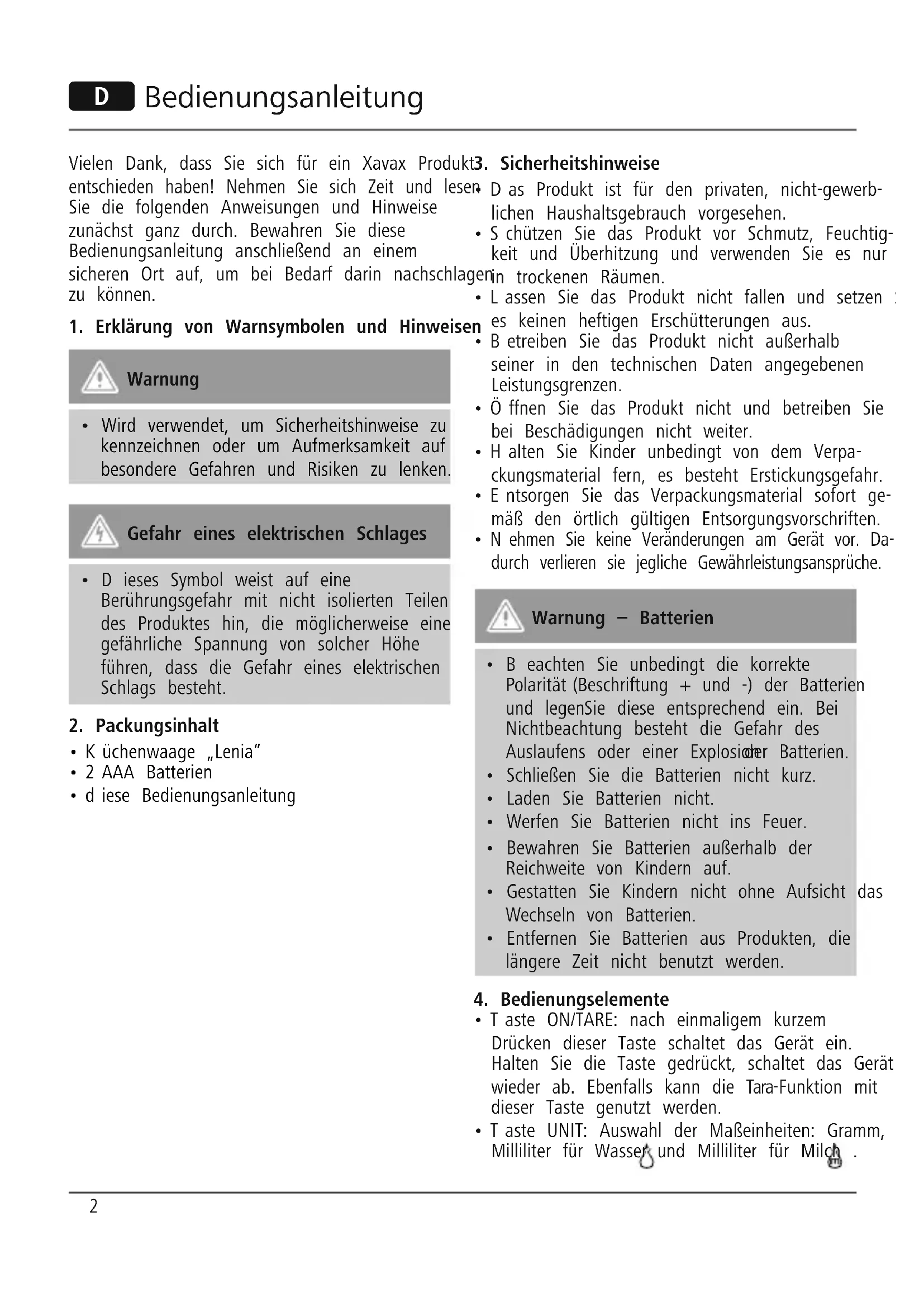 Hinweis zum Umweltschutz: Ab dem Zeitpunkt der Umsetzung der europäischen Richtlinien 2002/96/EG und 2006/66/EG in nationales Recht gilt folgendes: Elektrische und elektronische Geräte sowie Batterien dürfen nicht mit dem Hausmüll entsorgt werden. Der Verbraucher ist gesetzlich verpichtet, elektrische und elektronische Geräte sowie Batterien am Ende ihrer Lebensdauer an den dafür eingerichteten, öffentlichen Sammelstellen oder an die Verkaufsstelle zurückzugeben.Einzelheiten dazu regelt das jeweilige Landesrecht. Das Symbol auf dem Produkt, der Gebrauchsanleitung oder der Verpackung weist auf diese Bestimmungen hin. Mit der Wiederverwertung, der stoichen Verwertung oder anderen Formen der Verwertung von Altgeräten/Batterien leisten Sie einen wichtigen Beitrag zum Schutz unserer Umwelt.5 G Operating instruction Thank you for choosing a Xavax product. Take your time and read the following instructions and information completely. Keep these operating instructions in a safe place for future reference.