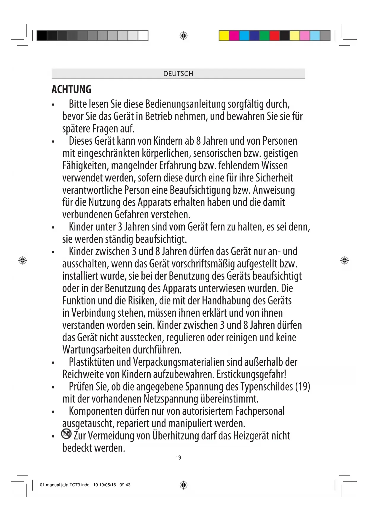- Das Gerät verfügt über einen Überhitzungsschutz, welcher bei Überhitzung den Stromkreis unterbricht. Der Ventilator, der zur Abkühlung des Geräts dient, wird dabei nicht abgeschaltet. 01 manual jata TC73.indd 20 19/05/16 09:4321