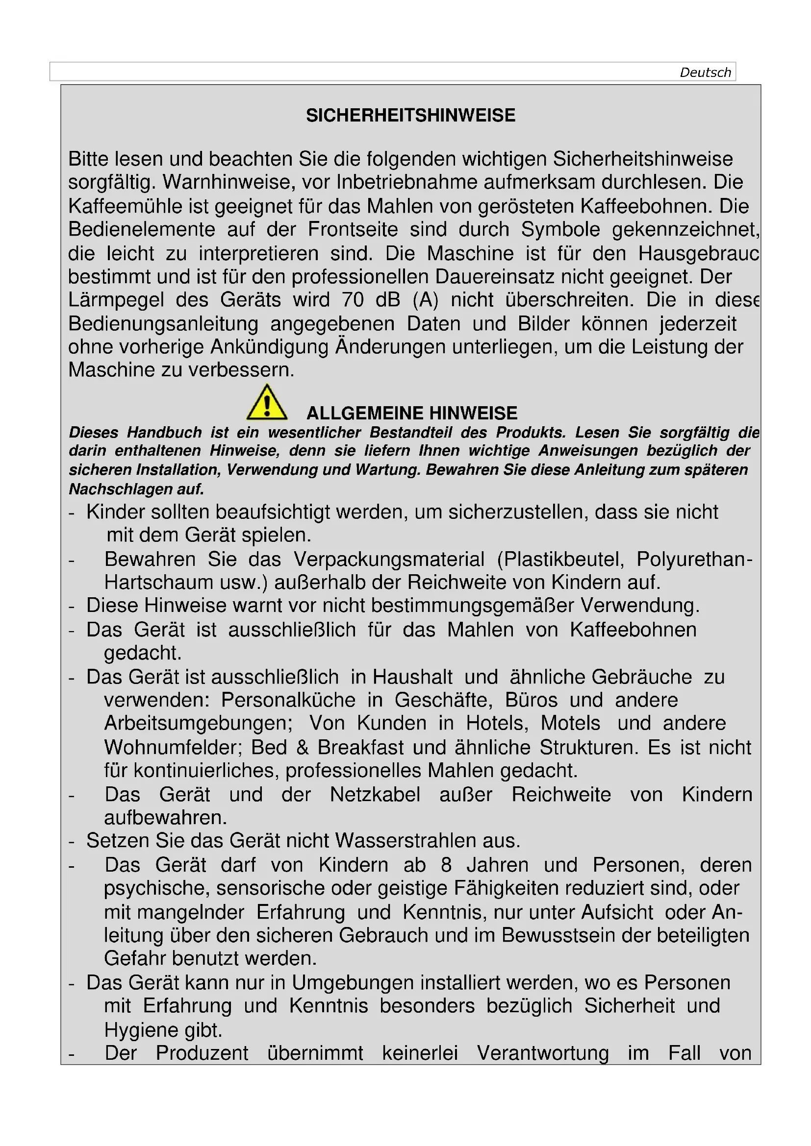 SICHERHEITSHINWEISE Bitte lesen und beachten Sie die folgenden wichtigen Sicherheitshinweise sorgfältig. Warnhinweise, vor Inbetriebnahme aufmerksam durchlesen. Die Kaffeemühle ist geeignet für das Mahlen von gerösteten Kaffeebohnen. Die Bedienelemente auf der Frontseite sind durch Symbole gekennzeichnet, die leicht zu interpretieren sind. Die Maschine ist für den Hausgebrauch bestimmt und ist für den professionellen Dauereinsatz nicht geeignet. Der Lärmpegel des Geräts wird 70 dB (A) nicht überschreiten. Die in dieser Bedienungsanleitung angegebenen Daten und Bilder können jederzeit ohne vorherige Ankündigung Änderungen unterliegen, um die Leistung der Maschine zu verbessern. ALLGEMEINE HINWEISE Dieses Handbuch ist ein wesentlicher Bestandteil des Produkts. Lesen Sie sorgfältig die darin enthaltenen Hinweise, denn sie liefern Ihnen wichtige Anweisungen bezüglich der sicheren Installation, Verwendung und Wartung. Bewahren Sie diese Anleitung zum späteren Nachschlagen auf. - Kinder sollten beaufsichtigt werden, um sicherzustellen, dass sie nicht mit dem Gerät spielen. - Bewahren Sie das Verpackungsmaterial (Plastikbeutel, Polyurethan- Hartschaum usw.) außerhalb der Reichweite von Kindern auf. - Diese Hinweise warnt vor nicht bestimmungsgemäßer Verwendung. - Das Gerät ist ausschließlich für das Mahlen von Kaffeebohnen gedacht. - Das Gerät ist ausschließlich in Haushalt und ähnliche Gebräuche zu verwenden: Personalküche in Geschäfte, Büros und andere Arbeitsumgebungen; Von Kunden in Hotels, Motels und andere Wohnumfelder; Bed & Breakfast und ähnliche Strukturen. Es ist nicht für kontinuierliches, professionelles Mahlen gedacht. - Das Gerät und der Netzkabel außer Reichweite von Kindern aufbewahren. - Setzen Sie das Gerät nicht Wasserstrahlen aus. - Das Gerät darf von Kindern ab 8 Jahren und Personen, deren psychische, sensorische oder geistige Fähigkeiten reduziert sind, oder mit mangelnder Erfahrung und Kenntnis, nur unter Aufsicht oder An- leitung über den sicheren Gebrauch und im Bewusstsein der beteiligten Gefahr benutzt werden. - Das Gerät kann nur in Umgebungen installiert werden, wo es Personen mit Erfahrung und Kenntnis besonders bezüglich Sicherheit und Hygiene gibt. - Der Produzent übernimmt keinerlei Verantwortung im Fall vonAufbrechen von Komponenten. - Reinigung und Pflege können nicht von Kindern ohne Aufsicht geführt werden. - Jede andere Verwendung als die oben beschriebene ist nicht bestimmungsgemäß und kann Gefahren in sich bergen; der Produzent übernimmt keinerlei Verantwortung im Fall von Schäden aufgrund nicht bestimmungsgemäßer Verwendung des Geräts. - Wir können keine Verantwortung für die Verwendung von anderen als Originalersatzteilen und/oder Originalzubehör übernehmen. - Wir können keine Verantwortung für Reparaturen, die von nicht autorisierten Servicezentren durchgeführt werden, übernehmen. - Das Gerät darf nicht unbeaufsichtigt gelassen oder im Freien verwendet werden. - Setzen Sie das Gerät nicht Witterungsbedingungen (Regen, Sonne, Frost) aus. - Das Gerät nicht mit Wasserstrahl reinigen oder ins Wasser tauchen. - Jeglichen Kontakt mit beweglichen Teilen vermeiden. - Vor dem Beginn stellen Sie sicher, dass es im Bohnenbehälter keinen Fremdkörper gibt. In allen oben genannten Fällen erlischt die Garantie. GRUNDLEGENDE SICHERHEITSINFORMATIONEN Weil das Gerät mit elektrischem Strom betrieben wird, können Stromschläge nicht ausgeschlossen werden. Deshalb sollten die folgenden Sicherheitshinweise sorgfältig eingehalten werden. - Vor dem Einschalten sicherstellen, dass die Netzspannung derjenigen Spannung entspricht, die auf dem Schild auf der Rückseite des Geräts angegeben ist, und dass das elektrische System mit einer Erdungsleitung ausgestattet ist. - Das Gerät nicht manipulieren. Für jegliche Probleme wenden Sie sich bitte an den nächstgelegenen autorisierten Servicetechniker oder Kundendienstzentrum. - Berühren Sie das Gerät nicht mit nassen Händen oder Füßen. - Berühren Sie den Netzstecker nicht mit nassen Händen. - Stellen Sie sicher, dass die verwendete Steckdose immer frei zugänglich ist, denn nur dann können Sie den Stecker bei Bedarf herausziehen. - Wenn Sie den Stecker aus der Steckdose herausziehen, sollten Sie direkt am Stecker ziehen. Ziehen Sie niemals am Kabel, weil es dann beschädigt werden könnte. - Um das Gerät vollständig vom Netz zu trennen, ziehen Sie den Stecker aus der Steckdose. - Wenn das Gerät defekt ist, versuchen Sie nicht, es zu reparieren. Schalten Sie es aus, ziehen Sie den Netzstecker aus der Steckdoseund kontaktieren Sie den Kundendienst. - Im Falle von Schäden am Stecker oder am Versorgungskabel müssen diese ausschließlich vom Kundendienst ersetzt werden. - Verwenden Sie keine Adapter, Steckerleisten und/oder Verlängerungskabel. Falls die Verwendung derselben nicht vermeidbar ist, verwenden Sie nur Einfachadapter oder Mehrfachadapter und Verlängerungskabel, die den aktuellen Sicherheitsstandards entsprechen. Stellen Sie jedoch sicher, dass die auf dem Einfachadapter und dem Verlängerungskabel angegebene maximale Kapazität und die auf dem Mehrfachadapter angegebene maximale Belastbarkeit nicht überschritten wird. - Die Verwendung von Adaptern, die vom Produzenten nicht verkauft worden sind, kann Feuer, Elektroschock oder Verletzung verursachen. - Ziehen Sie den Stecker aus der Steckdose, wenn das Gerät unbeaufsichtigt gelassen ist oder vor der Assemblierung, dem Ausbau oder der Reinigung. - Um Verletzungsrisiken zu mindern, lassen Sie nie das Versorgungskabel von dem Tisch hängen oder in der Nähe von heißen Flächen, Kanten, scharfen Gegenständen.