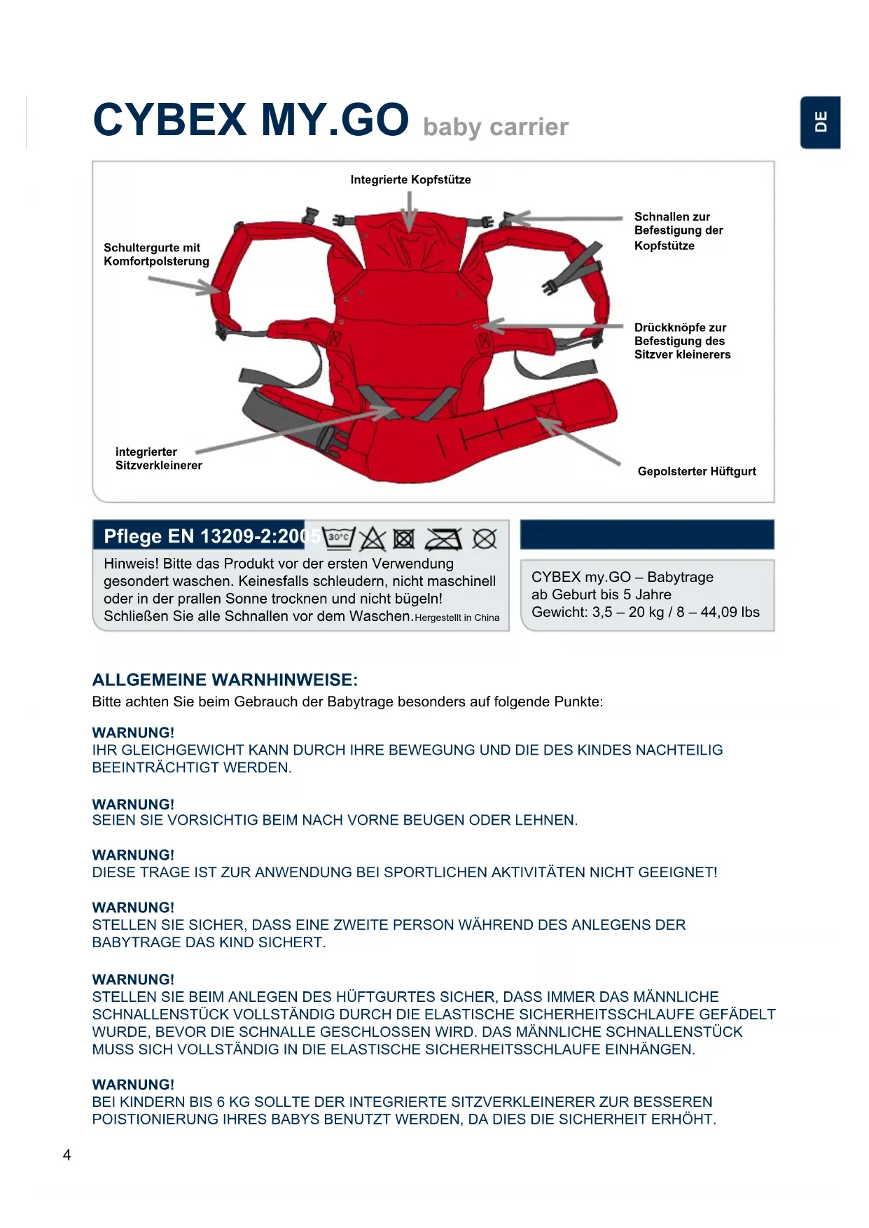 CYBEX MY.GO baby carrier Hinweis! Bitte das Produkt vor der ersten Verwendung gesondert waschen. Keinesfalls schleudern, nicht maschinell oder in der prallen Sonne trocknen und nicht bügeln! Schließen Sie alle Schnallen vor dem Waschen.CYBEX my.GO – Babytrage ab Geburt bis 5 Jahre Gewicht: 3,5 – 20 kg / 8 – 44,09 lbs Pege EN 13209-2:2005 ALLGEMEINE WARNHINWEISE: WARNUNG! WARNUNG! WARNUNG! WARNUNG! WARNUNG! WARNUNG! BEI KINDERN BIS 6 KG SOLLTE DER INTEGRIERTE SITZVERKLEINERER ZUR BESSEREN POISTIONIERUNG IHRES BABYS BENUTZT WERDEN, DA DIES DIE SICHERHEIT ERHÖHT.IHR GLEICHGEWICHT KANN DURCH IHRE BEWEGUNG UND DIE DES KINDES NACHTEILIG BEEINTRÄCHTIGT WERDEN.STELLEN SIE SICHER, DASS EINE ZWEITE PERSON WÄHREND DES ANLEGENS DER BABYTRAGE DAS KIND SICHERT.STELLEN SIE BEIM ANLEGEN DES HÜFTGURTES SICHER, DASS IMMER DAS MÄNNLICHE SCHNALLENSTÜCK VOLLSTÄNDIG DURCH DIE ELASTISCHE SICHERHEITSSCHLAUFE GEFÄDELT WURDE, BEVOR DIE SCHNALLE GESCHLOSSEN WIRD. DAS MÄNNLICHE SCHNALLENSTÜCK MUSS SICH VOLLSTÄNDIG IN DIE ELASTISCHE SICHERHEITSSCHLAUFE EINHÄNGEN. SEIEN SIE VORSICHTIG BEIM NACH VORNE BEUGEN ODER LEHNEN.DIESE TRAGE IST ZUR ANWENDUNG BEI SPORTLICHEN AKTIVITÄTEN NICHT GEEIGNET!Bitte achten Sie beim Gebrauch der Babytrage besonders auf folgende Punkte:Schultergurte mit KomfortpolsterungIntegrierte KopfstützeSchnallen zur Befestigung der KopfstützeDrückknöpfe zur Befestigung des Sitzver kleinerers Gepolsterter Hüftgurt integrierter SitzverkleinererHergestellt in China5