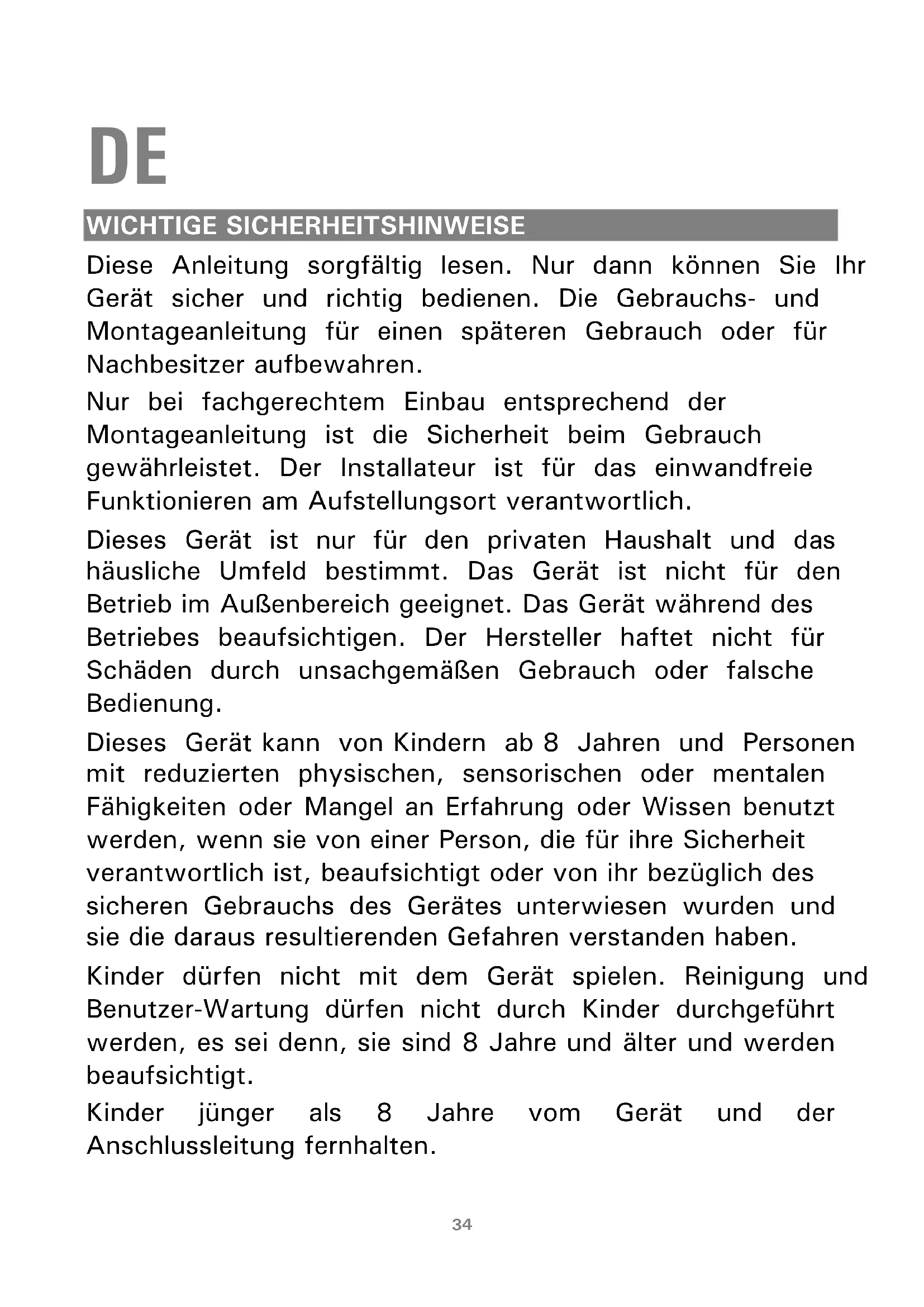 WICHTIGE SICHERHEITSHINWEISE Diese Anleitung sorgfältig lesen. Nur dann können Sie Ihr Gerät sicher und richtig bedienen. Die Gebrauchs- und Montageanleitung für einen späteren Gebrauch oder für Nachbesitzer aufbewahren. Nur bei fachgerechtem Einbau entsprechend der Montageanleitung ist die Sicherheit beim Gebrauch gewährleistet. Der Installateur ist für das einwandfreie Funktionieren am Aufstellungsort verantwortlich. Dieses Gerät ist nur für den privaten Haushalt und das häusliche Umfeld bestimmt. Das Gerät ist nicht für den Betrieb im Außenbereich geeignet. Das Gerät während des Betriebes beaufsichtigen. Der Hersteller haftet nicht für Schäden durch unsachgemäßen Gebrauch oder falsche Bedienung. Dieses Gerät kann von Kindern ab 8 Jahren und Personen mit reduzierten physischen, sensorischen oder mentalen Fähigkeiten oder Mangel an Erfahrung oder Wissen benutzt werden, wenn sie von einer Person, die für ihre Sicherheit verantwortlich ist, beaufsichtigt oder von ihr bezüglich des sicheren Gebrauchs des Gerätes unterwiesen wurden und sie die daraus resultierenden Gefahren verstanden haben. Kinder dürfen nicht mit dem Gerät spielen. Reinigung und Benutzer-Wartung dürfen nicht durch Kinder durchgeführt werden, es sei denn, sie sind 8 Jahre und älter und werden beaufsichtigt. Kinder jünger als 8 Jahre vom Gerät und der Anschlussleitung fernhalten.35 Das Gerät nach dem Auspacken prüfen. Bei einem Transportschaden nicht anschließen. Nur ein konzessionierter Fachmann darf Geräte ohne Stecker anschließen. Bei Schäden durch falschen Anschluss besteht kein Anspruch auf Garantie. Erstickungsgefahr! Verpackungsmaterial ist für Kinder gefährlich. Kinder nie mit Verpackungsmaterial spielen lassen. Lebensgefahr! Zurückgesaugte Verbrennungsgase können zu Vergiftungen führen. Immer für ausreichend Zuluft sorgen, wenn das Gerät im Abluftbetrieb gleichzeitig mit einer raumluftabhängigen Feuerstätte verwendet wird. Raumluftabhängige Feuerstätten (z. B. gas-, öl-, holz- oder kohlebetriebene Heizgeräte, Durchlauferhitzer, Warmwasserbereiter) beziehen Verbrennungsluft aus dem Aufstellraum und führen die Abgase durch eine Abgasanlage (z. B. Kamin) ins Freie. In Verbindung mit einer eingeschalteten Dunstabzugshaube wird der Küche und den benachbarten Räumen Raumluft entzogen - ohne ausreichende Zuluft entsteht ein Unterdruck. Giftige Gase aus dem Kamin oder Abzugsschacht werden in die Wohnräume zurückgesaugt. ■ Es muss daher immer für ausreichende Zuluft gesorgt werden. ■ Ein Zuluft-/Abluftmauerkasten allein stellt die Einhaltung des Grenzwertes nicht sicher.36 Ein gefahrloser Betrieb ist nur dann möglich, wenn der Unterdruck im Aufstellraum der Feuerstätte 4 Pa (0,04 mbar) nicht überschreitet. Dies kann erreicht werden, wenn durch nicht verschließbare Öffnungen, z. B. in Türen, Fenstern, in Verbindung mit einem Zuluft/Abluftmauerkasten oder durch andere technische Maßnahmen die zur Verbrennung benötigte Luft nachströmen kann. Ziehen Sie in jedem Fall den Rat des zuständigen Schornsteinfegermeisters hinzu, der den gesamten Lüftungsverbund des Hauses beurteilen kann und Ihnen die passende Maßnahme zur Belüftung vorschlägt. Wird die Dunstabzugshaube ausschließlich im Umluftbetrieb eingesetzt, ist der Betrieb ohne Einschränkung möglich. Brandgefahr! ■ Die Fettablagerungen im Fettfilter können sich entzünden. Fettfilter mindestens alle 2 Monate reinigen. Gerät nie ohne Fettfilter betreiben. ■ Die Fettablagerungen im Fettfilter können sich entzünden. In der Nähe des Gerätes nie mit offener Flamme arbeiten (z.B. flambieren). Gerät nur dann in der Nähe einer Feuerstätte für feste Brennstoffe (z.B. Holz oder Kohle) installieren, wenn eine geschlossene, nicht abnehmbare Abdeckung vorhanden ist. Es darf keinen Funkenflug geben. ■ Heißes Öl und Fett entzündet sich schnell. Heißes Öl und Fett nie unbeaufsichtigt lassen. Nie ein Feuer mit Wasser37 löschen. Kochstelle ausschalten. Flammen vorsichtig mit Deckel, Löschdecke oder Ähnlichem ersticken. Verbrennungsgefahr! Die zugänglichen Teile werden im Betrieb heiß. Nie die heißen Teile berühren. Kinder fernhalten. Verletzungsgefahr! Bauteile innerhalb des Gerätes können scharfkantig sein. Schutzhandschuhe tra-gen.Verletzungsgefahr! Stromschlaggefahr! ■ Ein defektes Gerät kann einen Stromschlag verursachen. Nie ein defektes Gerät einschalten. Netzstecker ziehen oder Sicherung im Sicherungskasten ausschalten. Kundendienst rufen. ■ Unsachgemäße Reparaturen sind gefährlich. Nur ein von uns geschulter Kundendienstechniker darf Reparaturen durchführen und beschädigte Anschlussleitungen austauschen. Ist das Gerät defekt, Netzstecker ziehen oder Sicherung im Sicherungskasten ausschalten. Kundendienst rufen. ■ Eindringende Feuchtigkeit kann einen Stromschlag verursachen. Keinen Hochdruckreiniger oder Dampfreiniger verwenden. UMWELTSCHUTZ Hier erhalten Sie Tipps, wie Sie beim Betrieb der Dunstabzugshaube Energie sparen können. ENERGIE SPAREN ■ Beim Kochen ausreichend Zuluft sicherstellen, damit die Dunstabzugshaube effizient und mit geringen Betriebsgeräuschen arbeitet. ■ Lüfterstufe an die Intensität der Kochdünste anpassen. Die Intensivstufe nur nach Bedarf einsetzen. Eine kleinere Lüfterstufe bedeutet einen geringeren Energieverbrauch. ■ Bei intensiven Kochdünsten frühzeitig eine höhere Lüfterstufe wählen. Bereits in der Küche verteilte Kochdünste machen einen längeren Betrieb der Dunstabzugshaube erforderlich. ■ Dunstabzugshaube ausschalten, wenn sie nicht mehr benötigt wird. ■ Beleuchtung ausschalten, wenn sie nicht mehr benötigt wird.38 ■ Filter in den angegebenen Abständen reinigen bzw. wechseln, um die Wirksamkeit der Lüftung zu erhöhen und eine Brandgefahr zu vermeiden. ALLGEMEINES Eine Haube in ABLUFTBETRIEB saugt den Kochdunst am Entstehungsort an und leitet ihn ins Freie. Für diese Art von Luftreinigung sind keine Kohle-fil