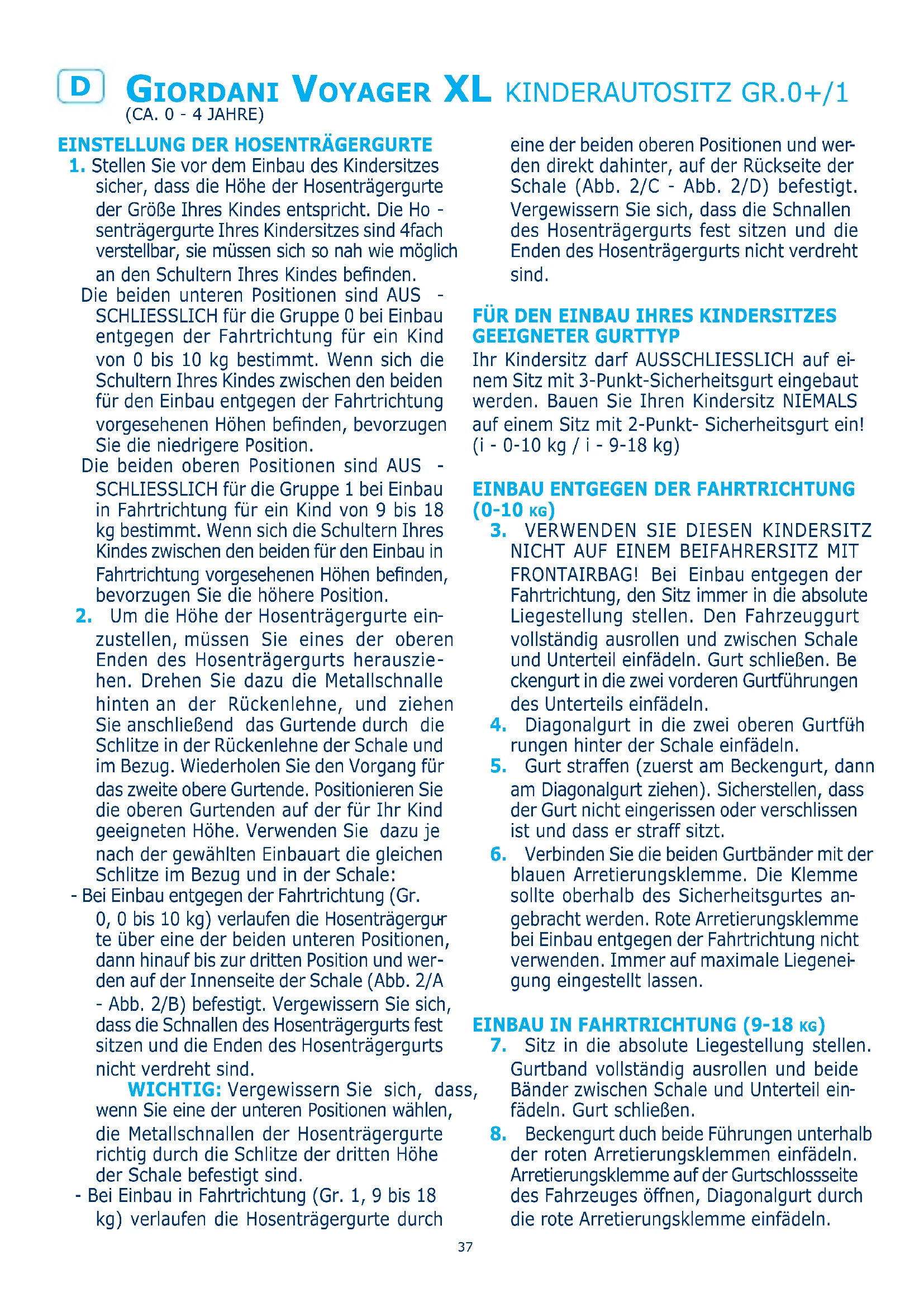 Laden Sie die Anleitung für Ihr Kindersitz kostenlos im PDF-Format! Finden Sie Ihr Handbuch Voyager - Giordani und nehmen Sie Ihr elektronisches Gerät wieder in die Hand. Auf dieser Seite sind alle Dokumente veröffentlicht, die für die Verwendung Ihres Geräts notwendig sind. Voyager von der Marke Giordani.