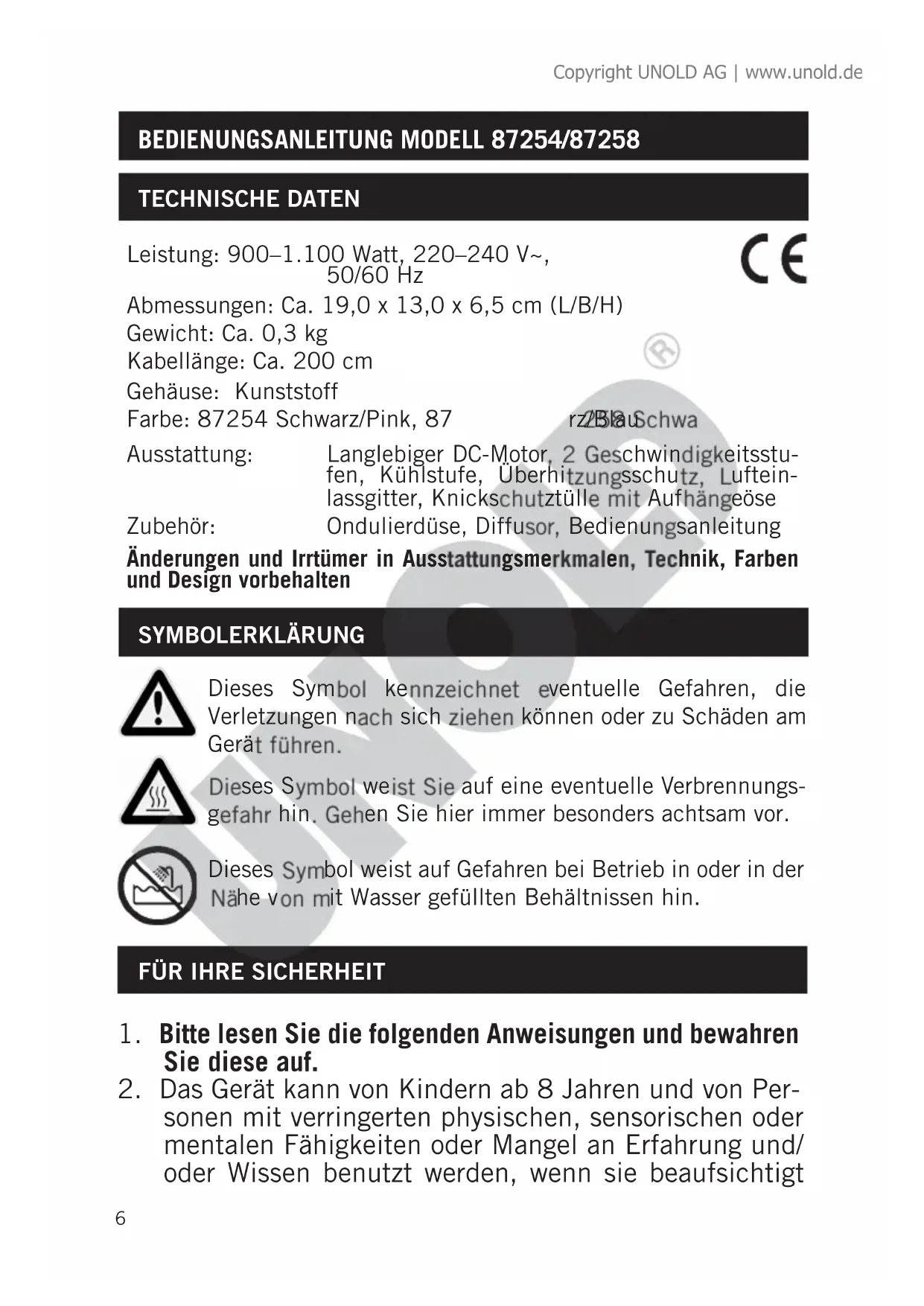 Hiermit erklärt die UNOLD AG, dass sich der Haartrockner 87254/87258 in Übereinstimmung mit den grundlegenden Anforderungen der europäischen Richtlinie für elektromagnetische Verträglichkeit (2004/108/EC) und der Niederspannungsrichtlinie bendet. Die Übereinstimmung mit den Regularien bezieht sich auf den Tag der Erstellung dieser Erklärung. Hockenheim, 14.6.2013 UNOLD AG, Mannheimer Straße 4, 68766 Hockenheim Copyright UNOLD AG | www.unold.de13 SCHWEIZ MENAGROS SA Route der Servion CH - 1083 Mezières Telefon +41 (0) 21 9 03 01-15 Telefax +41 (0) 21 9 03 01-11 E-Mail info@menagros.ch Internet www.menagros.ch Mannheimer Straße 4 68766 Hockenheim Kundendienst Tel. +49 (0) 62 05/94 18-27 Fax +49 (0) 62 05/94 18-22 E-Mail service@unold.de Internet www.unold.de ÖSTERREICH Reparaturabwicklung, Ersatzteile: ESC Electronic Service Center GmbH Molitorgasse 15 A-1110 Wien Telefon +43 (0) 1/9 71 70 59 Telefax +43 (0) 1/9 71 70 59 E-Mail office@esc-service.at POLEN „Quadra-net“ Sp. z o.o. Skadowa 5 61-888 Poznan Skadowa 5 Internet www.quadra-net.pl TSCHECHIEN befree.cz s.r.o. Škroupova 150 537 01 Chrudim Telefon +42 0 46 46 01 881 E-Mail obchod@befree.cz Sie möchten innerhalb der Garantiezeit ein Gerät zur Reparatur einsenden? Auf unserer Internetseite www.unold.de/ruecksendung können Sie sich einen Rücksendeschein ausdrucken, um damit das Paket kostenlos bei der Post abzugeben (nur für Einsendungen aus Deutschland und Österreich). DEUTSCHLAND SERVICE-ADRESSEN Copyright UNOLD AG | www.unold.de14 Power: 900–1,100 Watt, 220–240 V~, 50/60 Hz Dimensions: Approx. 19.0 x 13.0 x 6.5 cm Weight: Approx. 0.3 kg Power cord length: Approx. 200 cm Housing: Plastic Colour: 87254 Black/Pink; 87258 Black/Blue Features: Long lasting DC motor, 2 speed settings, cool shot/cool air setting, overheat protection, detachable air intake screen, flexible protective sleeve with hanging loop Accessories: Concentrator, diffuser, instruction manual Equipment features, technology, colours and design are subject to change without notice.