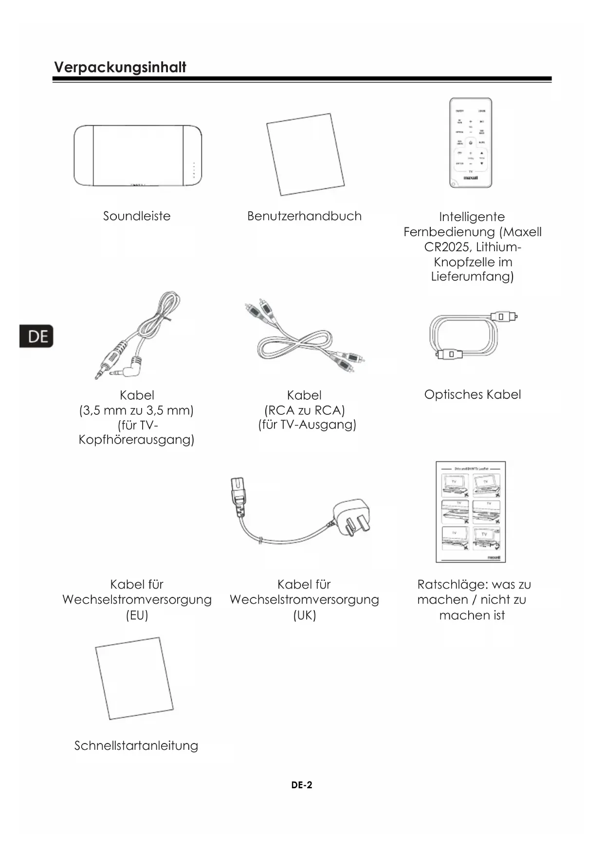 (D) : Das Batteriefach wieder in seinen Sitz einschieben. Vorsichtsmaßnahmen bezüglich der Batterien Wenn die intelligente Fernbedienung über längere Zeit (mehr als einen Monat) nicht gebraucht werden sollte, die Batterie aus der intelligenten Fernbedienung herausnehmen, um ein Auslaufen zu verhindern. Falls eine Batterie auslaufen sollte, das Batteriefach innen auswischen und die Batterie durch eine neue Batterie ersetzen. Keine anderen als die angegebenen Batterien verwenden. Die Batterien keiner Hitze aussetzen und sie nicht zerlegen. Batterien dürfen nie in Feuer oder Wasser geworfen werden. Die Batterien nicht zusammen mit anderen Metallgegenständen transportieren oder lagern. Dadurch kann es zu Kurzschlüssen, Auslaufen oder einer Explosion der Batterien kommen. Die Batterie nicht aufladen, außer es ist angegeben, dass es sich um eine aufladbare Batterie handelt.Anschlüsse DE-8 Installation eines Fernsehers am Gerät Die Soundleiste Maxell MXSB-252BT ist für die Benutzung mit Fernsehgeräten ausgelegt, die nicht mehr als 50 Kg wiegen und deren Standfläche und Tiefe jeweils unter 53 cm und 30 cm liegen. Die Soundleiste MXSB-252BT kann mit dem Großteil der Fernsehgeräte zu 42” verwendet werden. Auf das System darf jedoch kein Bildschirm mit Kathodenröhren (CRT) gestellt werden. Dieses System ist nicht für eine Verwendung mit diesem Fernsehgerättyp ausgelegt. Bezüglich der richtigen Installation des Gerätes halten Sie sich bitte an die Ratschläge, was „zu machen“ und was „nicht zu machen“ ist. Warnhinweis: Schalten Sie die Lautstärke des Fernsehgeräts oder anderer Audioquellen auf niedrig, bevor Sie die Anschlüsse vornehmen. Sonst kann eine plötzliche hohe Lautstärke erzeugt werden. Anschluss an die Stromversorgung Warnhinweis! Es besteht die Gefahr einer Beschädigung des Produkts! - Vergewissern Sie sich, dass die Nennspannung der Stromsteckdose der auf der Rückseite oder der Unterseite des Geräts angegebenen Spannung entspricht. - Stromschlaggefahr! Das Netzkabel immer am Stecker aus der Steckdose ziehen. Niemals am Kabel ziehen. - Vergewissern Sie sich, dass das passende Netzkabel verwendet wird.