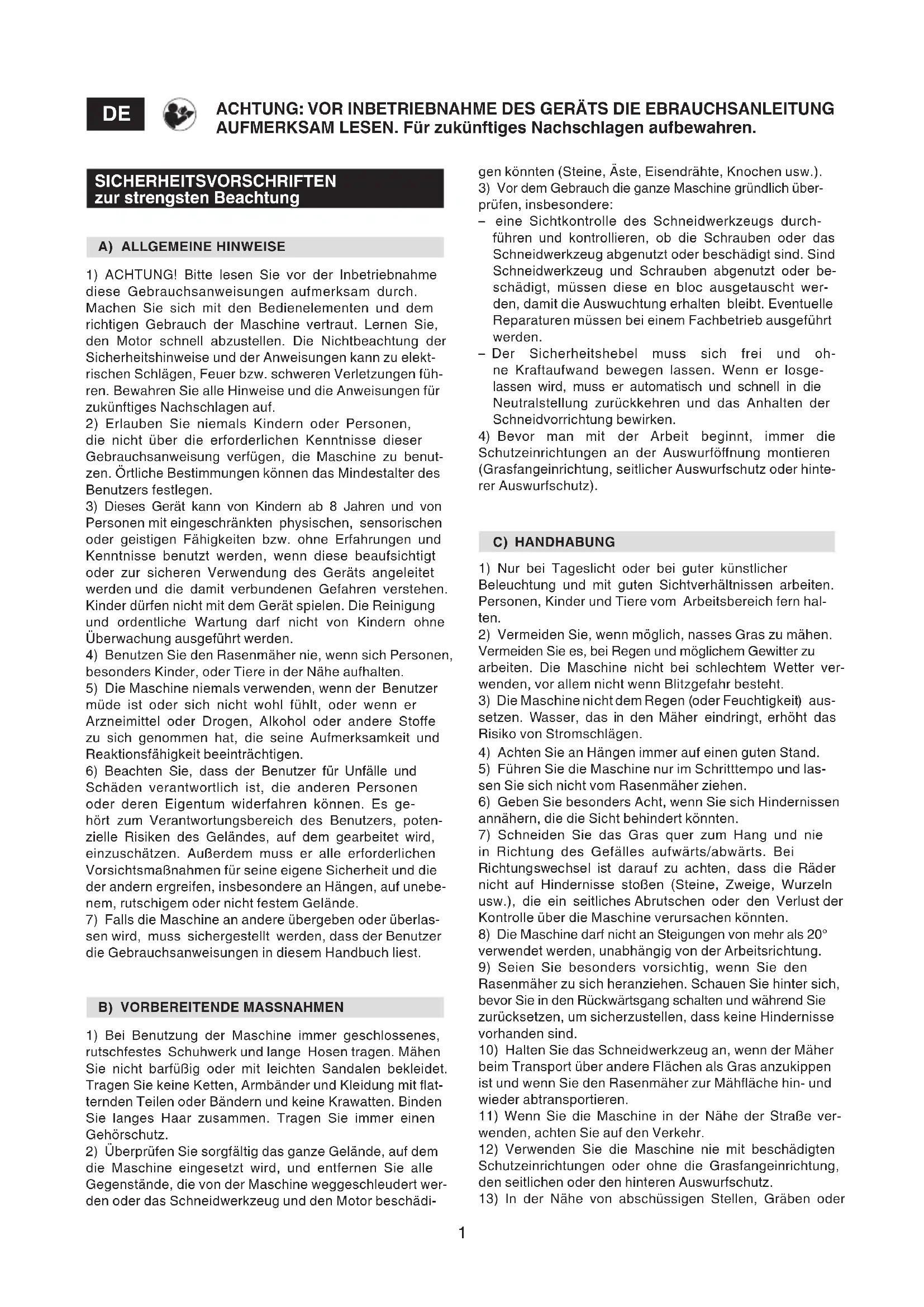 Schutzeinrichtungen an der Auswurfönung montieren (Grasfangeinrichtung, seitlicher Auswurfschutz oder hinte- rer Auswurfschutz). C) HANDHABUNG
