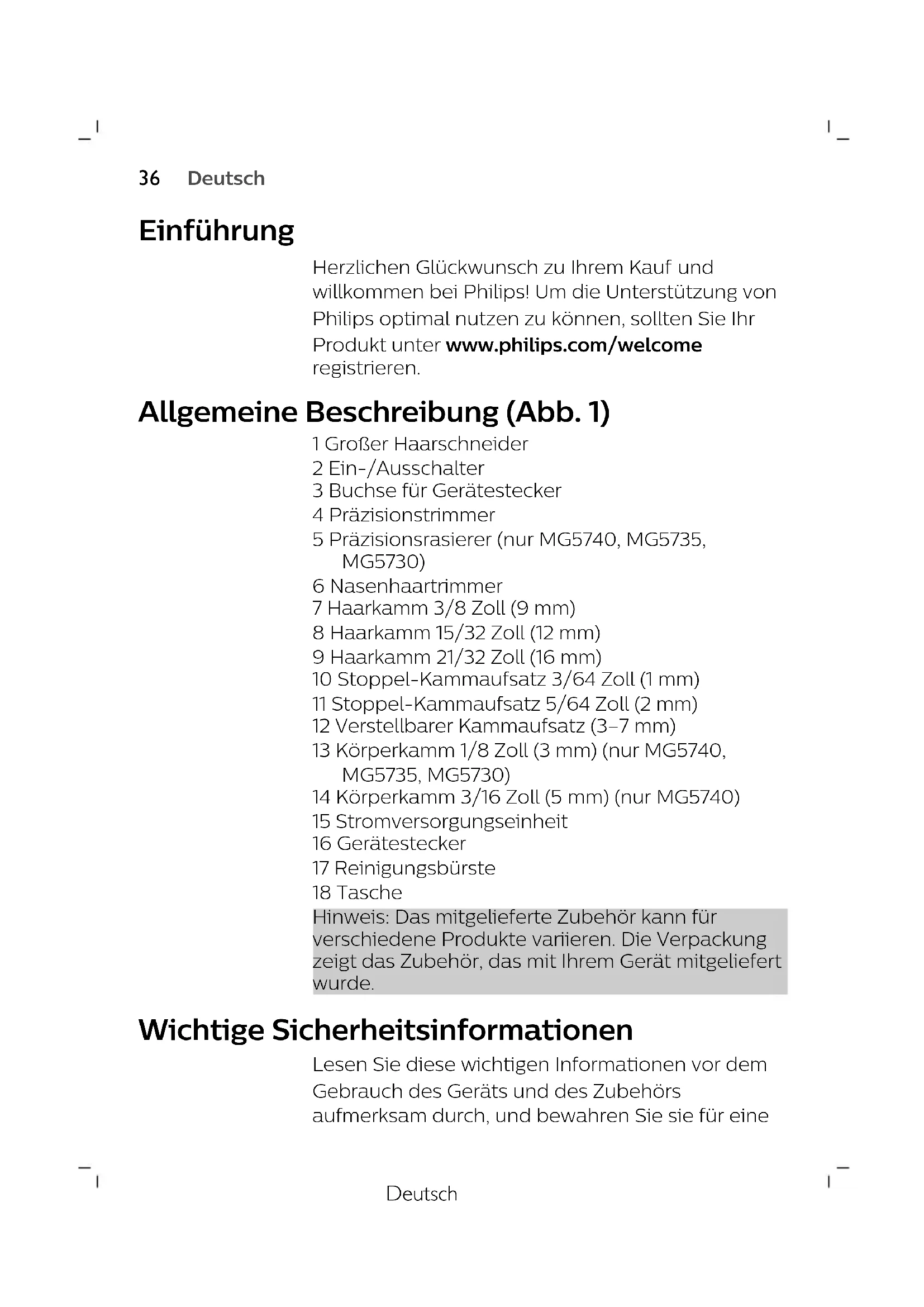 DanskDeutsch Einführung Herzlichen Glückwunsch zu Ihrem Kauf und willkommen bei Philips! Um die Unterstützung von Philips optimal nutzen zu können, sollten Sie Ihr Produkt unter www.philips.com/welcome registrieren. Allgemeine Beschreibung (Abb. 1) 1 Großer Haarschneider 2 Ein-/Ausschalter 3 Buchse für Gerätestecker 4 Präzisionstrimmer 5 Präzisionsrasierer (nur MG5740, MG5735, MG5730) 6 Nasenhaartrimmer 7 Haarkamm 3/8 Zoll (9 mm) 8 Haarkamm 15/32 Zoll (12 mm) 9 Haarkamm 21/32 Zoll (16 mm) 10 Stoppel-Kammaufsatz 3/64 Zoll (1 mm) 11 Stoppel-Kammaufsatz 5/64 Zoll (2 mm) 12 Verstellbarer Kammaufsatz (3–7mm) 13 Körperkamm 1/8 Zoll (3 mm) (nur MG5740, MG5735, MG5730) 14 Körperkamm 3/16 Zoll (5mm) (nur MG5740) 15 Stromversorgungseinheit 16 Gerätestecker 17 Reinigungsbürste 18 Tasche Hinweis: Das mitgelieferte Zubehör kann für verschiedene Produkte variieren. Die Verpackung zeigt das Zubehör, das mit Ihrem Gerät mitgeliefert wurde. Wichtige Sicherheitsinformationen Lesen Sie diese wichtigen Informationen vor dem Gebrauch des Geräts und des Zubehörs aufmerksam durch, und bewahren Sie sie für eine